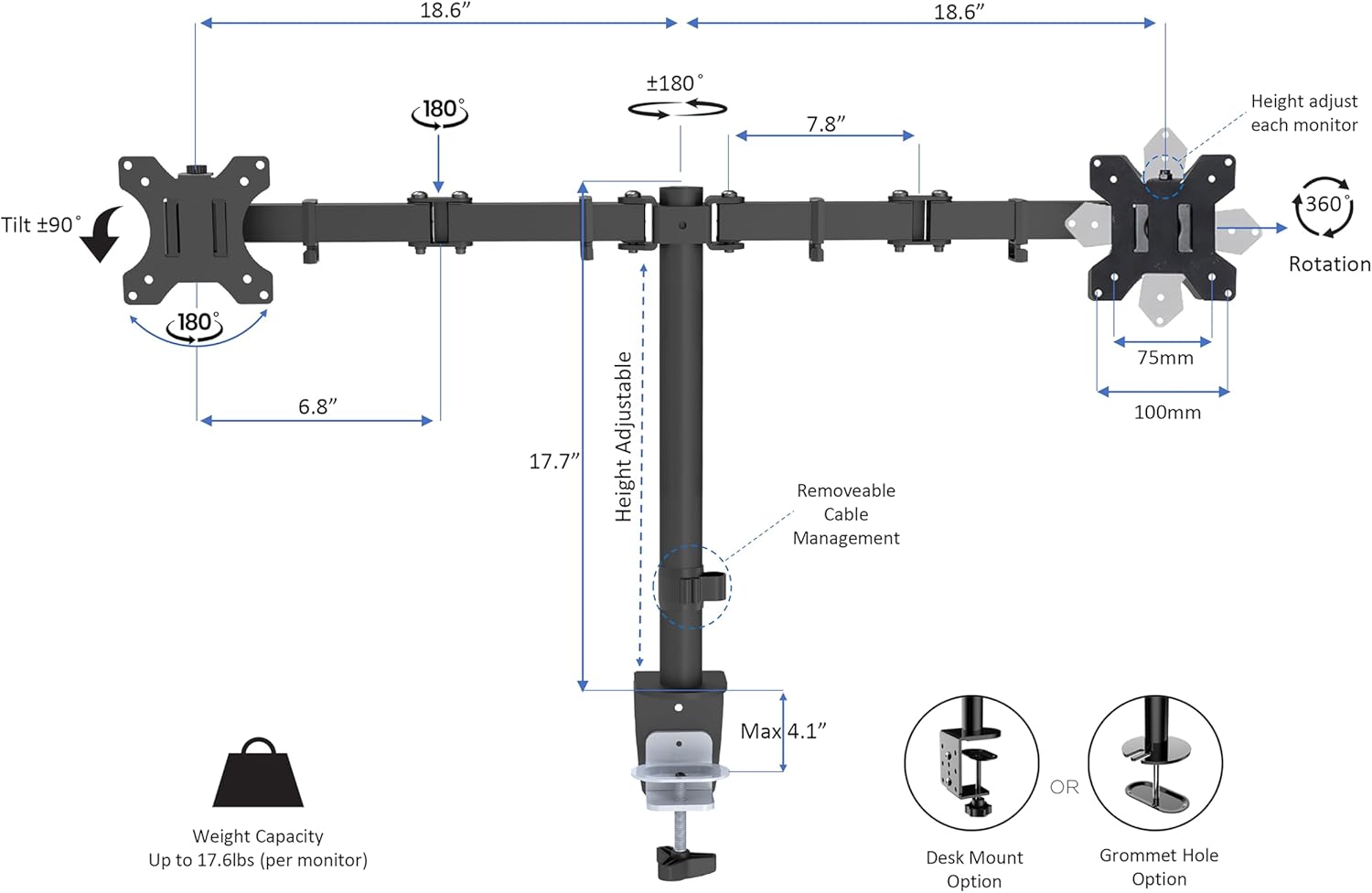 - Standing Desk Converter Bundle includes 37.5" Desk Riser (R DADRW) and Dual Monitor Arm (R DM2) for easy ergonomic positioning and optimal viewing comfort for 13"-27" flat panel monitors. Mount installs directly into convenient desktop grommet hole.