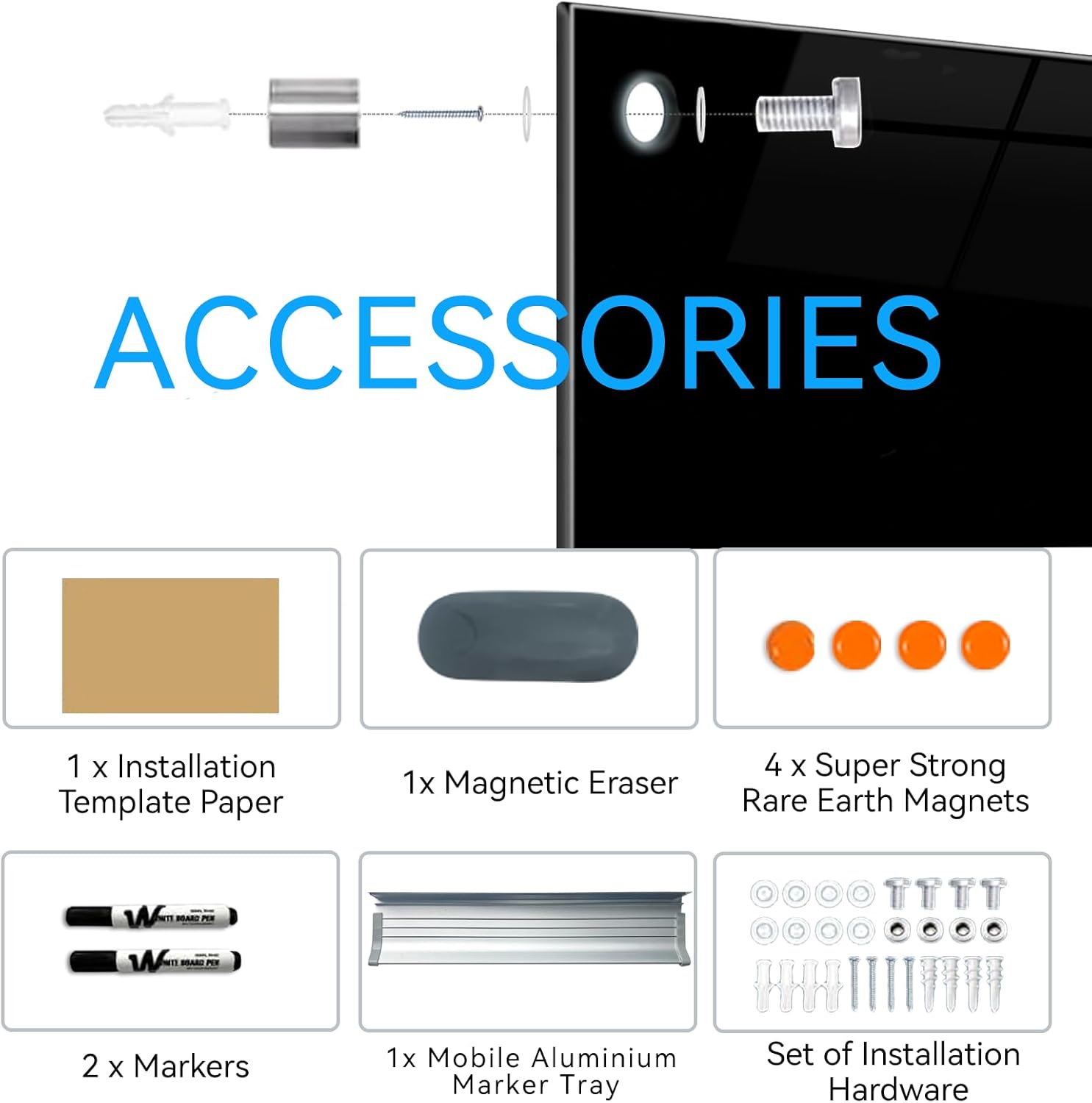- Modern Frameless Design: Frameless glass black board enhance your space and blend perfectly with any modern decor. You get more writing space—no more hard-to-reach corners! making it a fashionable focal point for your home, office or classroom