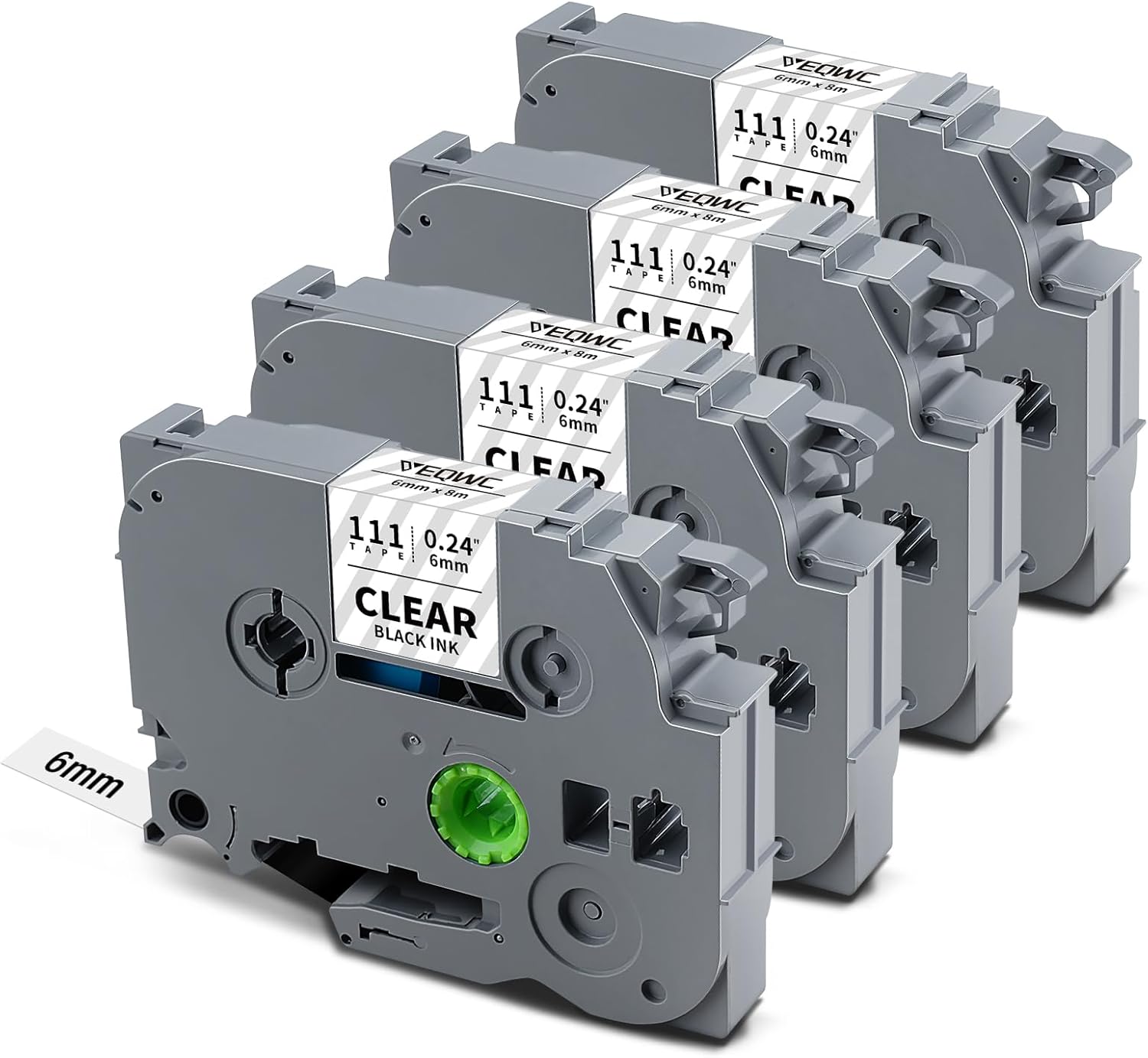 - Package Included: 4 Pack Replacements for Brother Ptouch label maker tapes black on clear TZe-111. Dimensions: Each pack measures 1/6" (0.23") in width and 26.2 ft (8m) in length, totaling 48 meters across all packs.