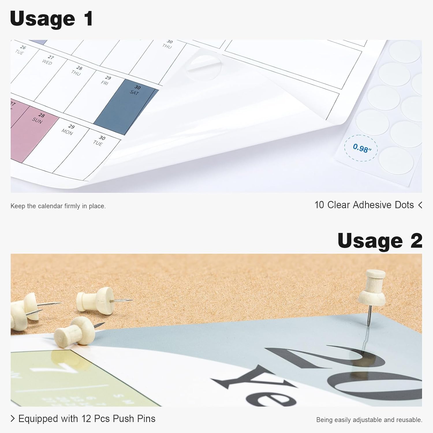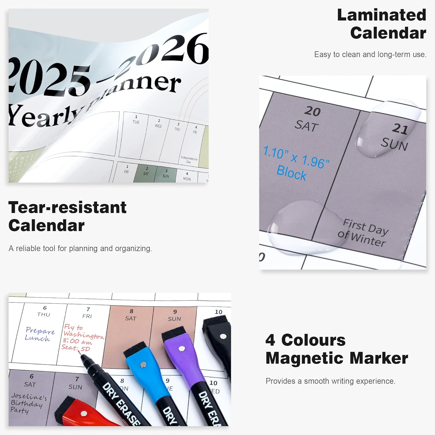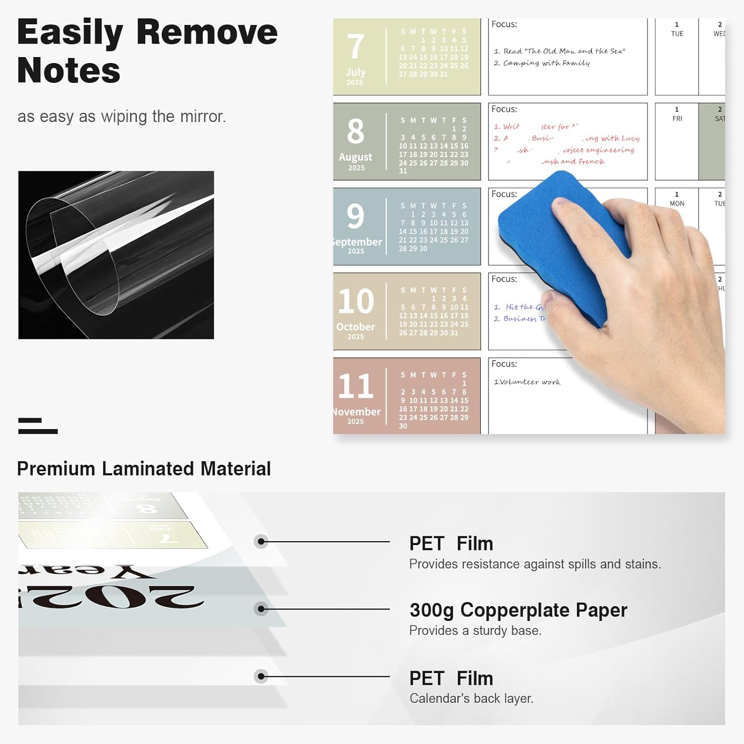 - ✨ Laminated Calendar with Dates: Waterproof wall calendar comes with a mini eraser, four dry-erase markers, 12 push pins, and 10 transparent round stickers. 12 months calendar covers the time range from July 2025 to June 2026, making it perfect for long-term use.