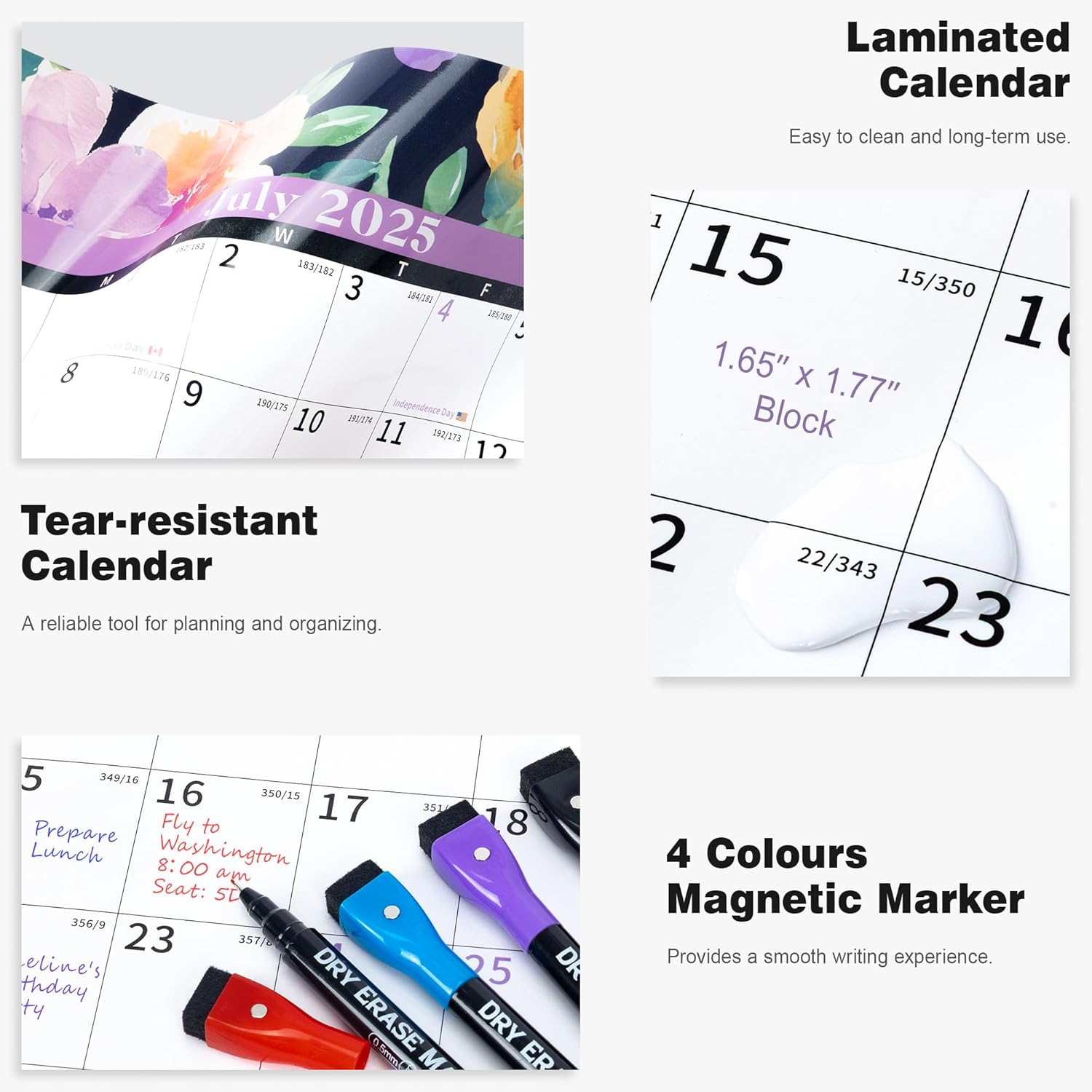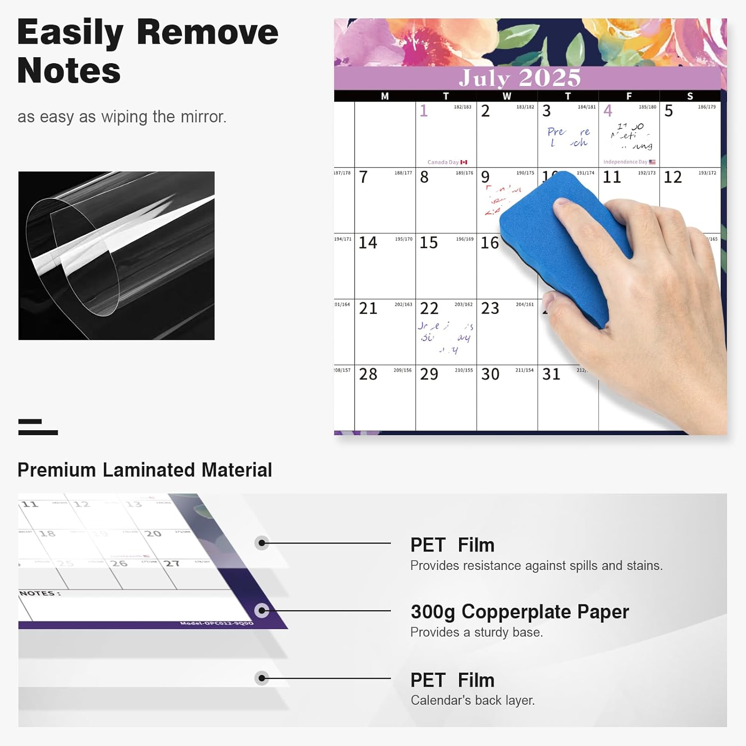 - ✨ Dry Erase Wall Calendar : is made of PET Film and 300 grams Copperplate Paper, providing a durable surface that resists scratches and smudges, while the sturdy Copperplate Paper backing keeps it in place without curling.