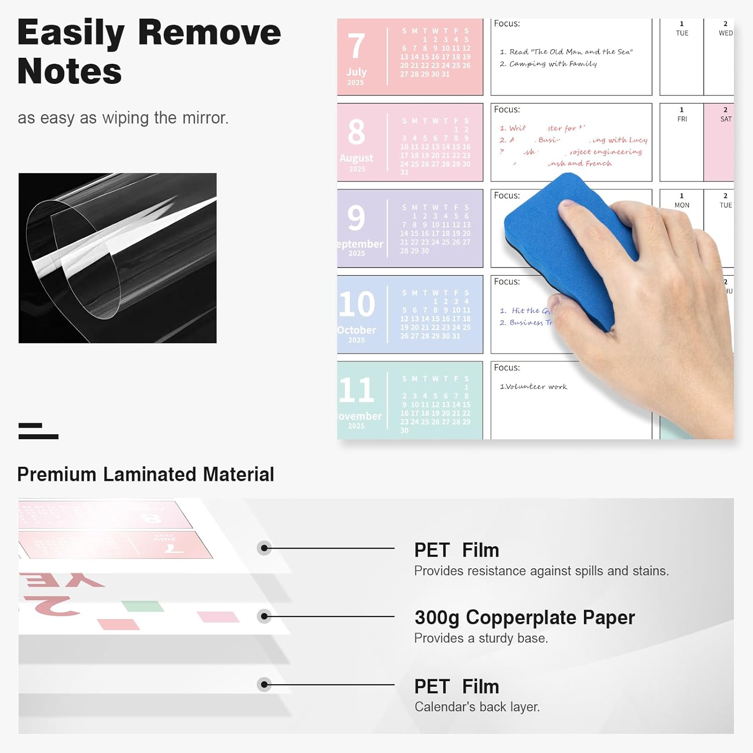 - ✨ Laminated Calendar with Dates: Waterproof wall calendar comes with a mini eraser, four dry-erase markers, 12 push pins, and 10 transparent round stickers. 12 months calendar covers the time range from July 2025 to June 2026, making it perfect for long-term use.