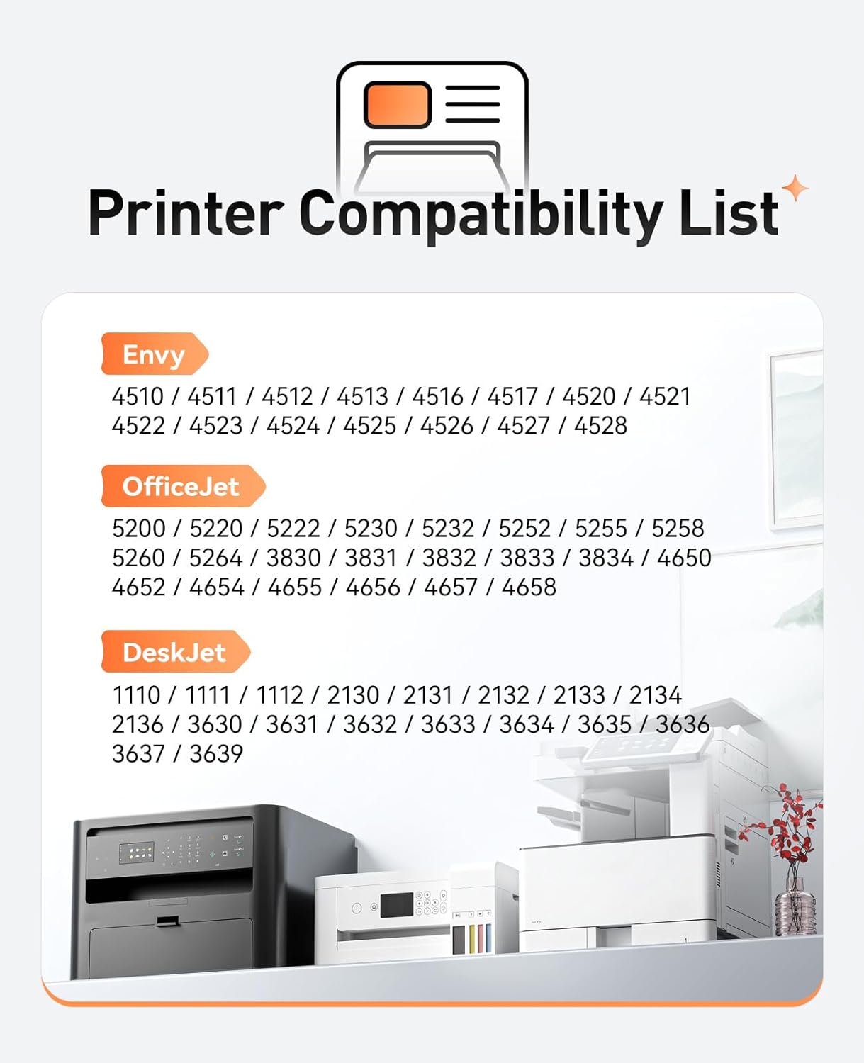 - Compatible Devices : Compatible with HP Envy series: 4510, 4511, 4512, 4513, 4516, 4517, 4520, 4521, 4522, 4523, 4524, 4525, 4526, 4527, 4528 printers Compatible with HP OfficeJet series: 5200, 5220, 5222, 5230, 5232, 5252, 5255, 5258, 5260, 5264, 3830, 3831, 3832, 3833, 3834, 4650, 4652, 4654, 4655, 4656, 4657, 4658 printers Compatible with HP DeskJet series: 1110, 1111, 1112, 2130, 2131, 2132, 2133, 2134, 2136, 3630, 3631, 3632, 3633, 3634, 3635, 3636, 3637, 3639 printers Compatible with HP Envy series: 4510, 4511, 4512, 4513, 4516, 4517, 4520, 4521, 4522, 4523, 4524, 4525, 4526, 4527, 4528 printers Compatible with HP OfficeJet series: 5200, 5220, 5222, 5230, 5232, 5252, 5255, 5258, 5260, 526… See more