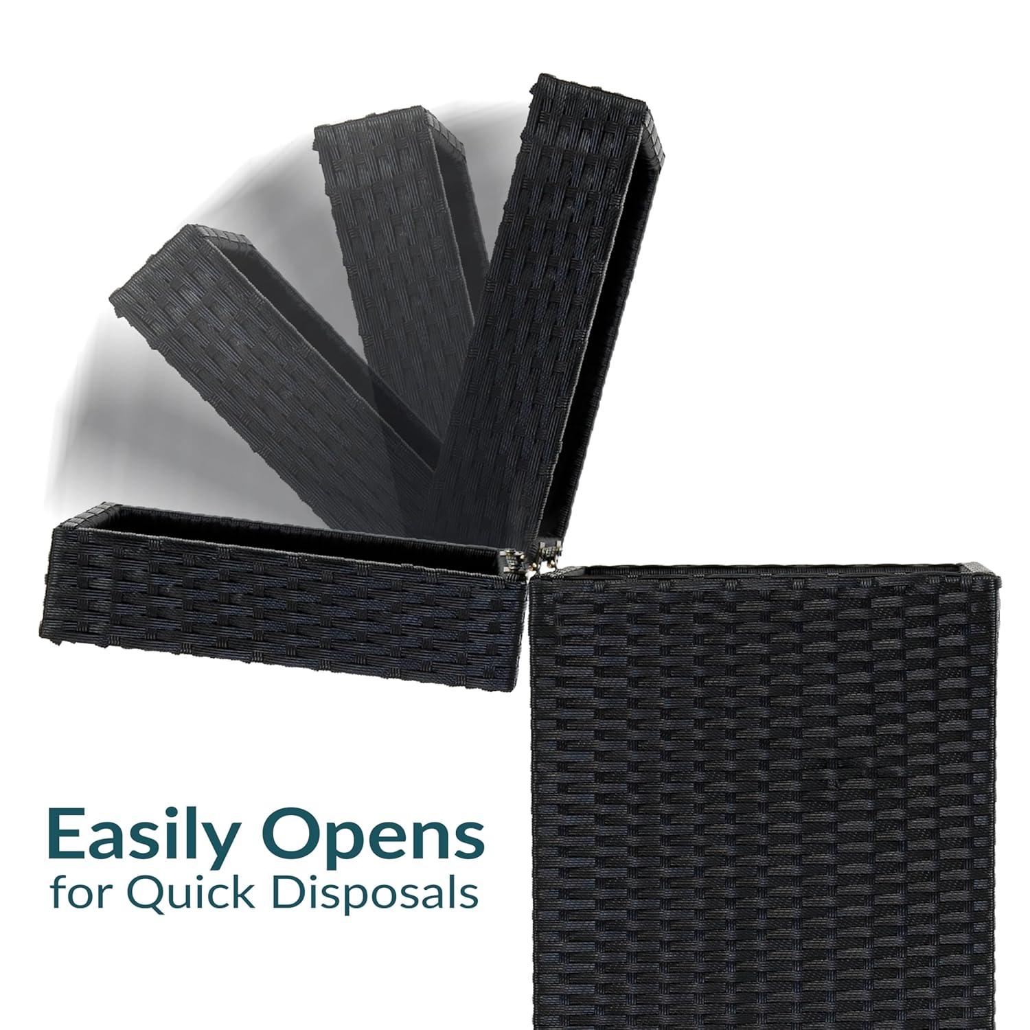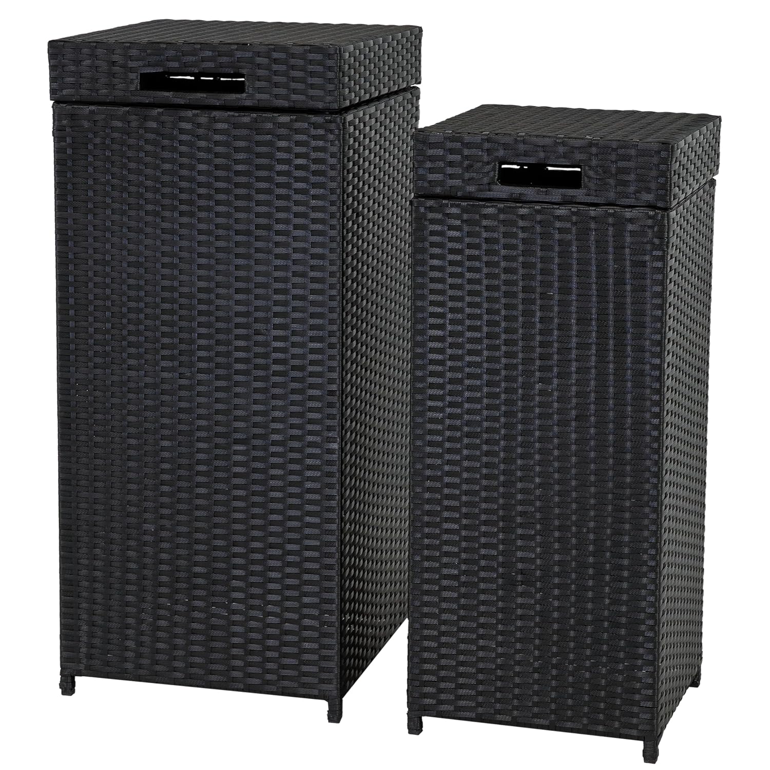 - DURABLE AND STYLISH DESIGN: These garbage containers are made of polypropylene plastic to resist the outdoor elements. Each patio trash can features a sturdy, powder-coated, steel tube frame for lasting strength. It features a stylish black wicker design to complement any decor.