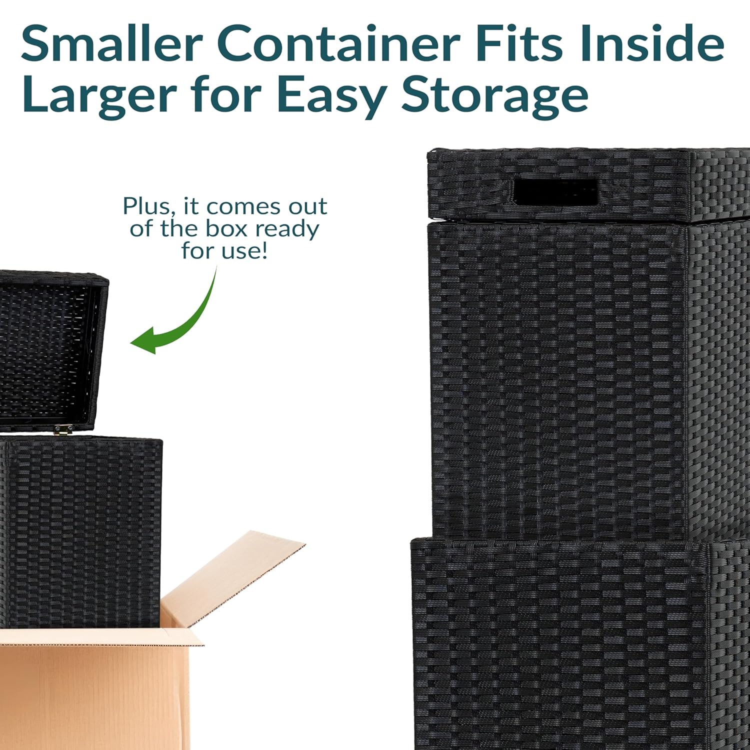 - FOR INDOOR OR OUTDOOR USE: Each convenient patio garbage can may be used for a variety of purposes. Use them as garbage containers in the kitchen, dining room, or on the patio. Store outdoor cushions or small toys in the backyard or deck, or place them in the laundry room or bedroom for use as laundry hampers.