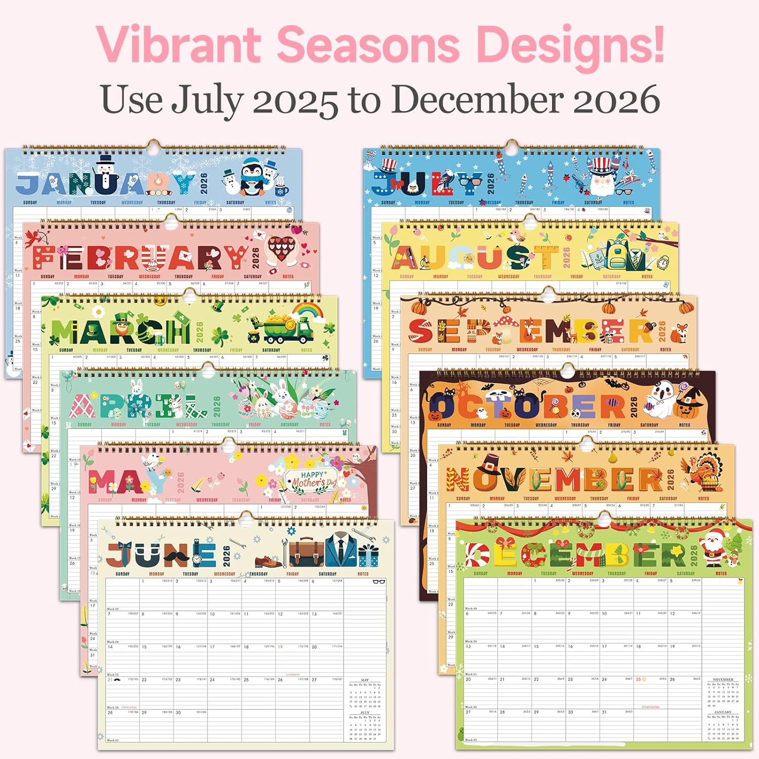 - COLORFUL DESIGN: In addition to being a quality planning tool, this wall calendar 2025-2026 is also a beautiful addition to your wall.This calendar perfectly balances functionality and style, serving as both a charming decor piece and a practical planner.12 different color combinations add a relaxed atmosphere and freshness to your office, home or classroom