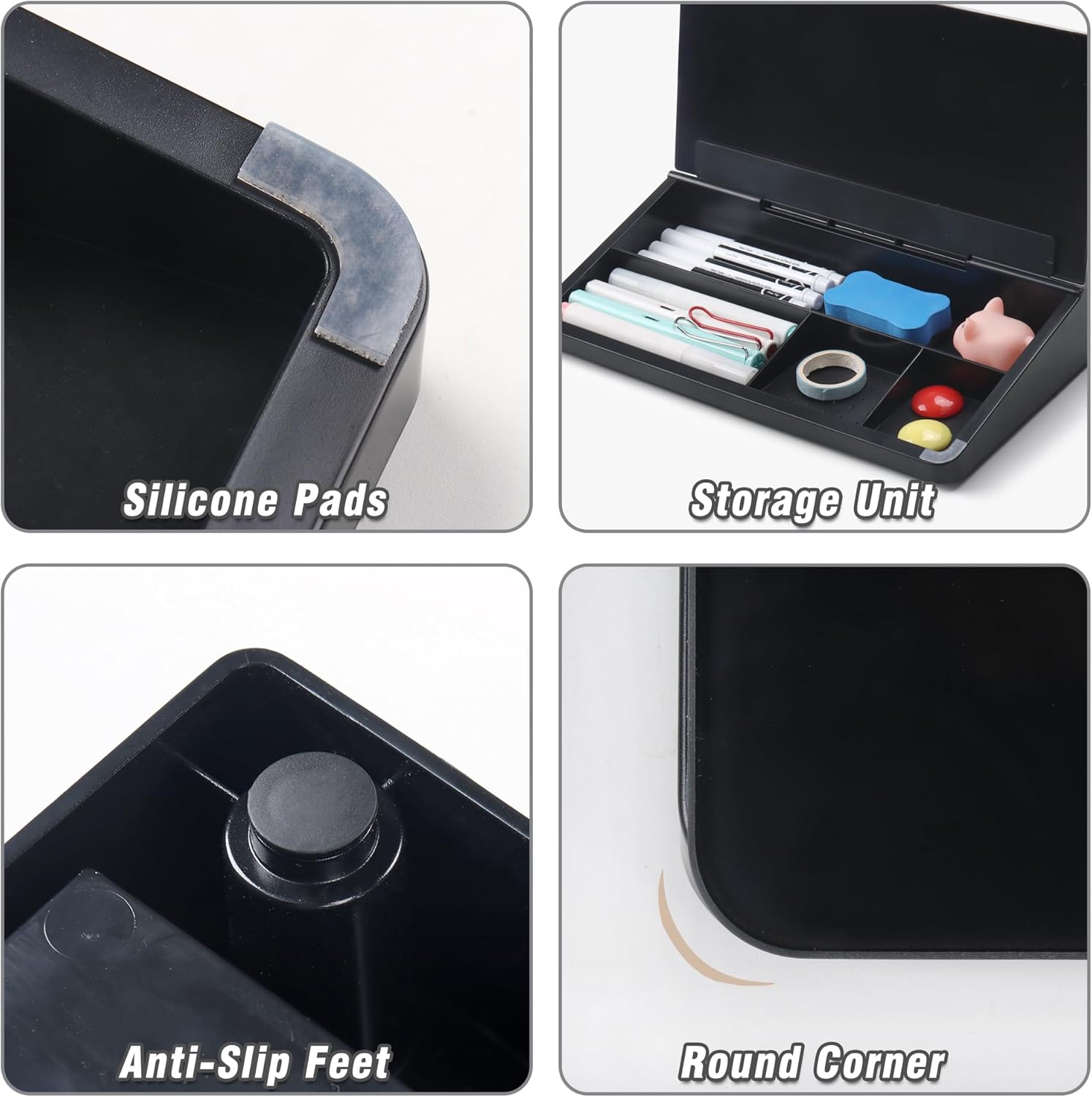 - ⚫️MULTIFUNCTIONAL: Writing+Storage+Hold+Keyboard Stand, our desktop white board is an all in one multipurpose. Equipped with 5 white dry erase markers and 1 blue eraser. One purchase, All in place!