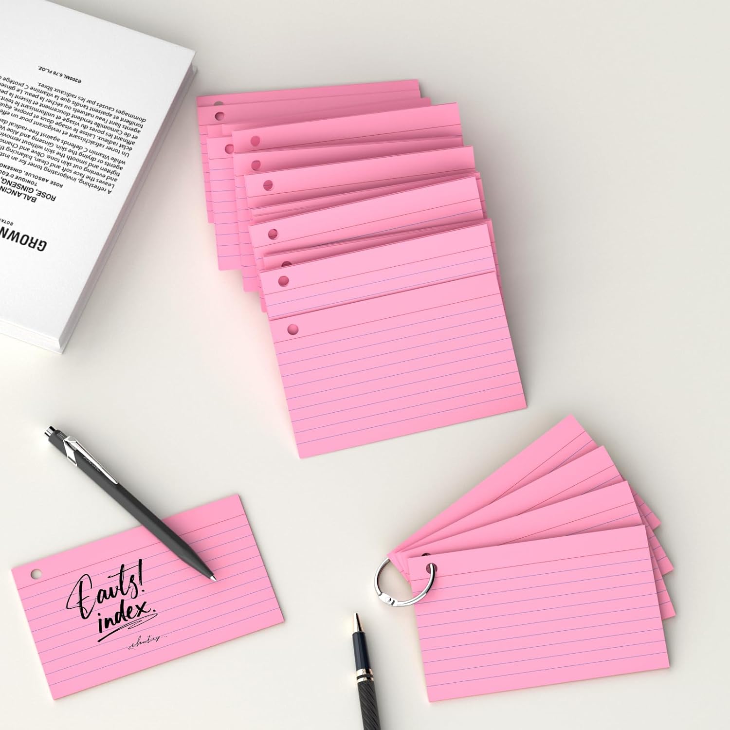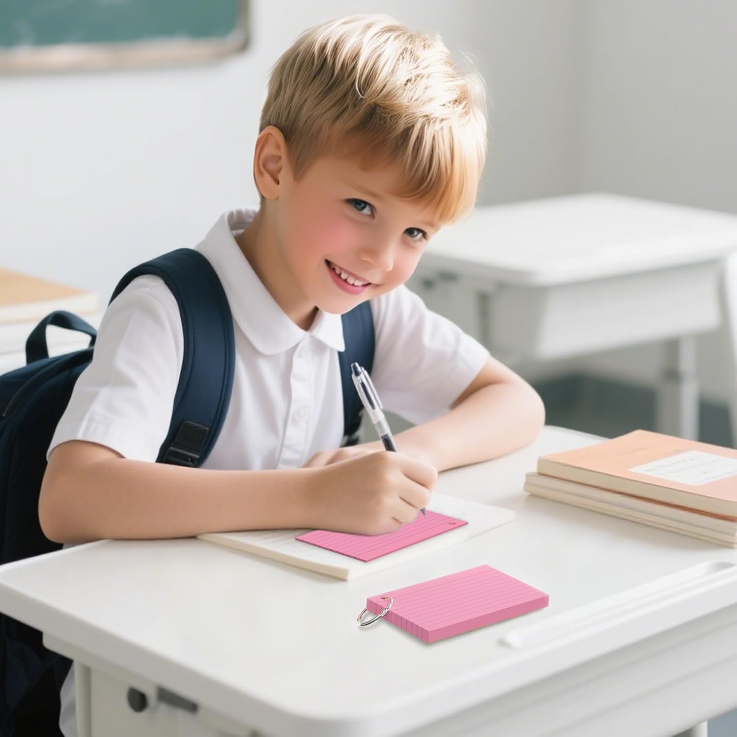 250 Count Pink Index Cards 3x5 Inch with Key Ring, Color Flash Index Card (50 Sheets Each), Durable & Portable Note Taking for Students, Teachers, Study Note Cards for Office Home School