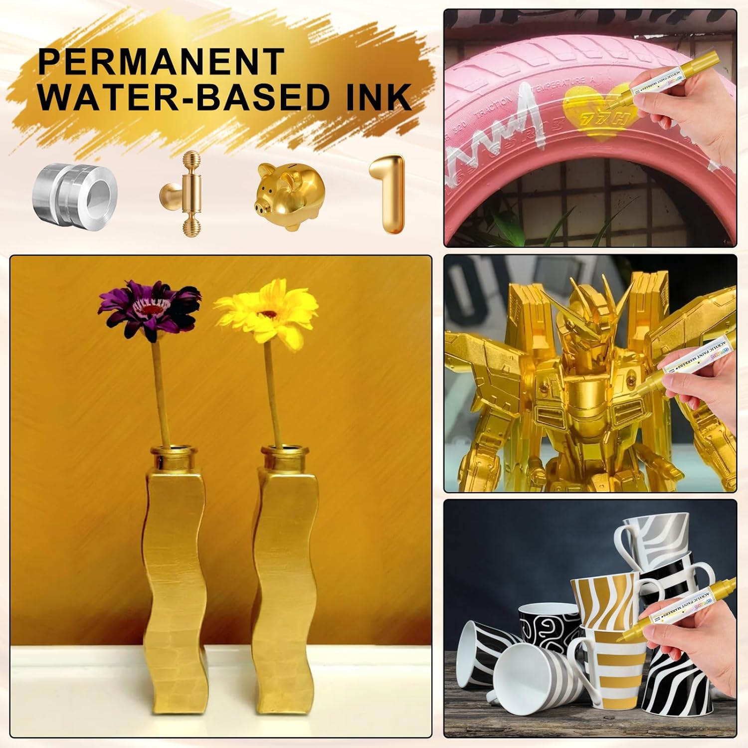 Paint Markers Paint Pens - 2 Pack Dual Tip Acrylic Permanent Marker (0.7mm & 3mm), Non-Toxic, Water-Based for Art Painting, Stone, Ceramic, Glass, Wood, Fabric, Metal, DIY Crafts (Gold)