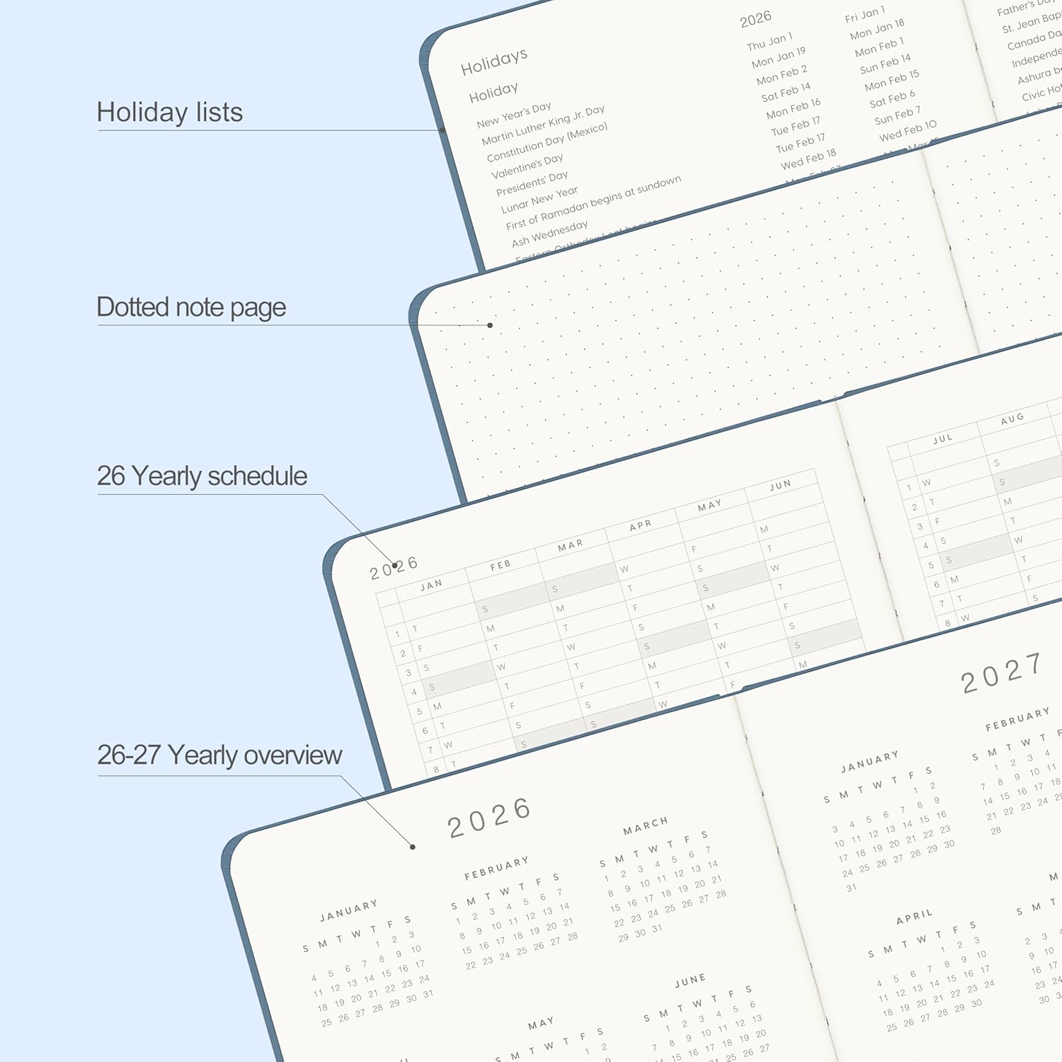 - MONTHLY OVERVIEW:Each date box provides enough writing space, including a display of holidays for each month, and the right notes row is additional planning space. 2 Ribbon bookmarks and month displays for easy navigation and lookup.