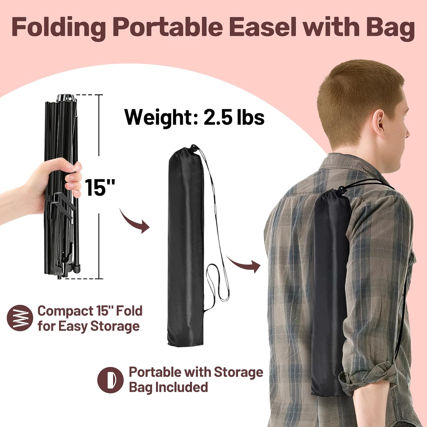 - Folding Portable Easel with Bag - This portable easel weighs just 2.5 pounds and folds down to 15 inches. It comes with a storage bag for easy storage and on-the-go carrying