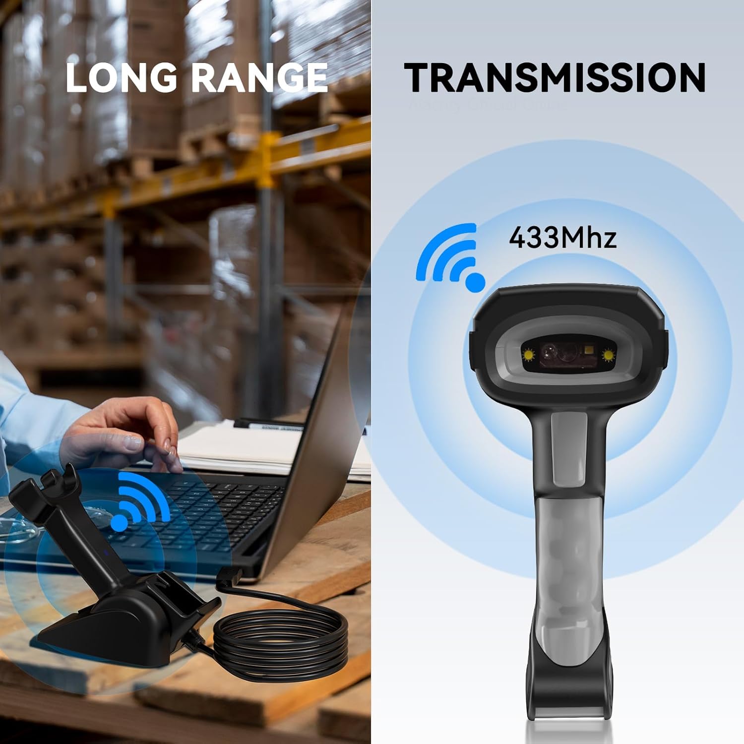 Alacrity Industrial Barcode Scanner, 1D/2D Symbologies, Wireless Charging, Long-Distance 433MHz Wireless & Bluetooth Connectivity, Shock and Dust-Proof Barcode Reader, Green