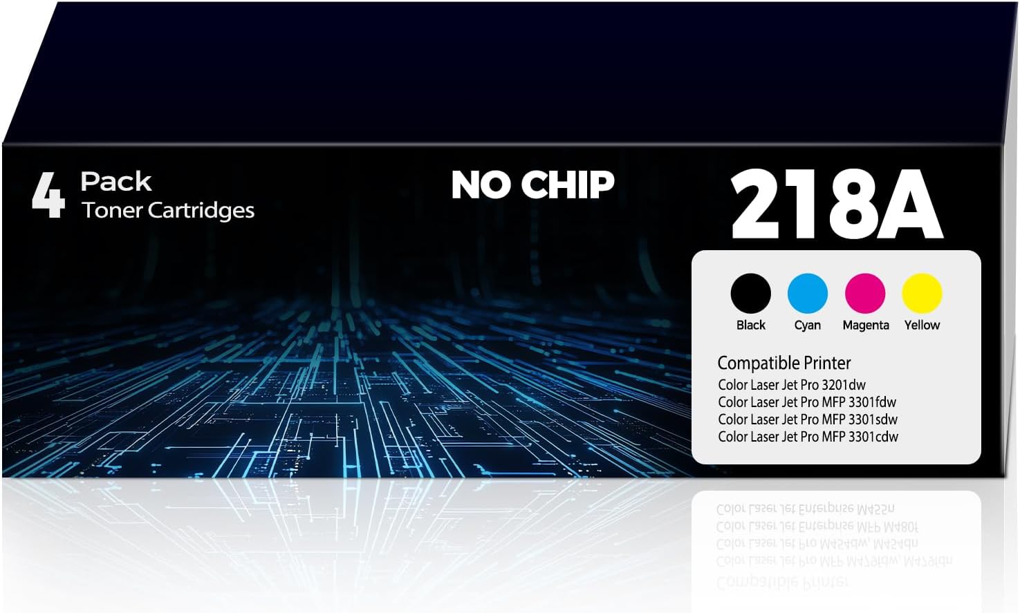 - 218A Toner Cartridges 4 Pack (No Chip) Printer Compatibility: 218A toner ink are compatible with HP Color Laser Jet Pro 3201dw, Color Laser Jet Pro MFP 3301fdw, Color Laser Jet Pro MFP 3301sdw, Color Laser Jet Pro MFP 3301cdw, Color Laser Jet Pro 3201dw toner cartridges, Color Laser Jet Pro MFP 3301fdw toner cartridges, Color Laser Jet Pro MFP 3301sdw toner cartridges, Color Laser Jet Pro MFP 3301cdw toner cartridges, 3301 3302 Series Wireless All-In-One Laser Printer.