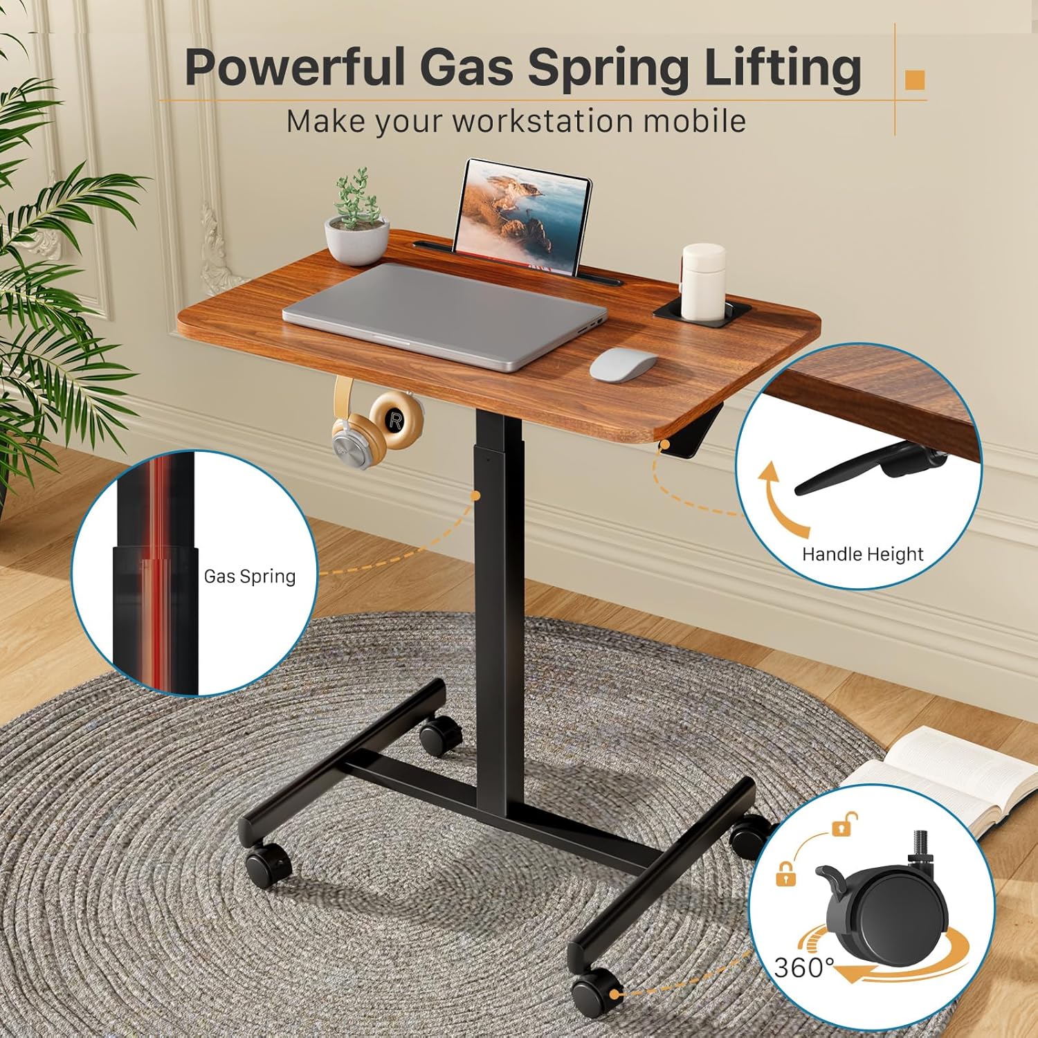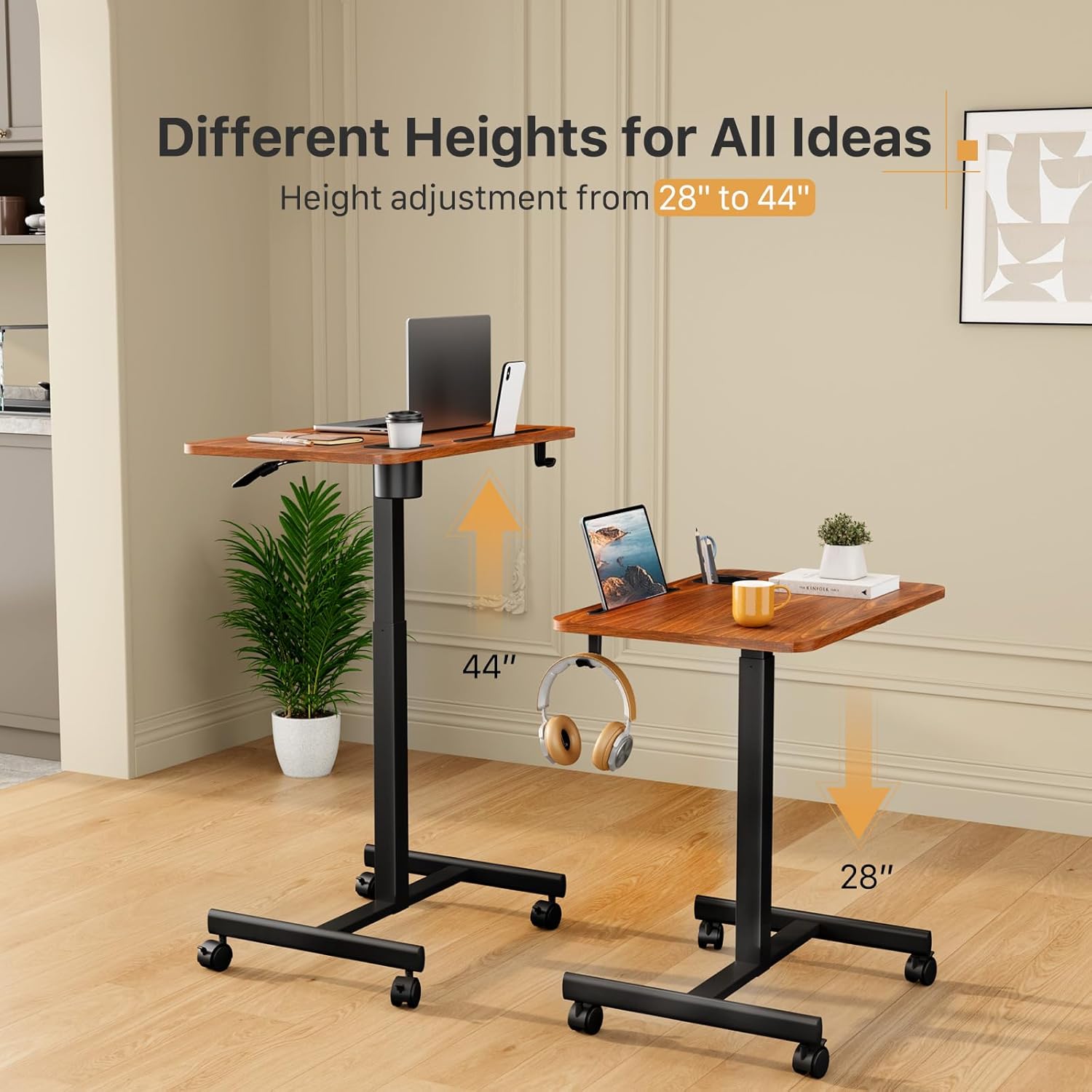 Mobile Standing Desk, Rolling Laptop Cart Adjustable Height with Cup Holder, 28 inch Portable Table with 4 Lockable Wheels, Walnut Computer Workstation with Hook and Slots for Home Office
