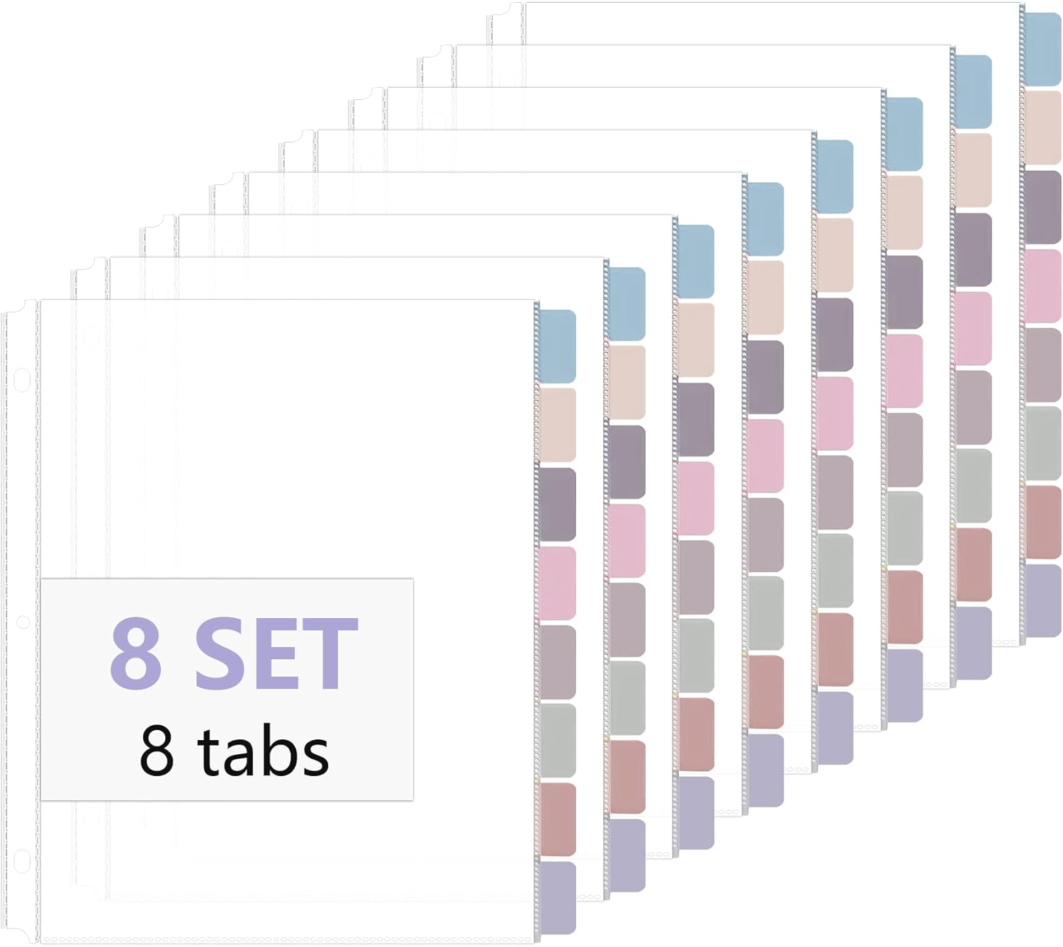 8 Set of 64 Pack Clear Binder Sheet Protectors for 3 Ring Binder Plastic Page Protector with 8 Tabs,Insertable Index Page Divider 8.5x11 Inch(Morandi Colors)