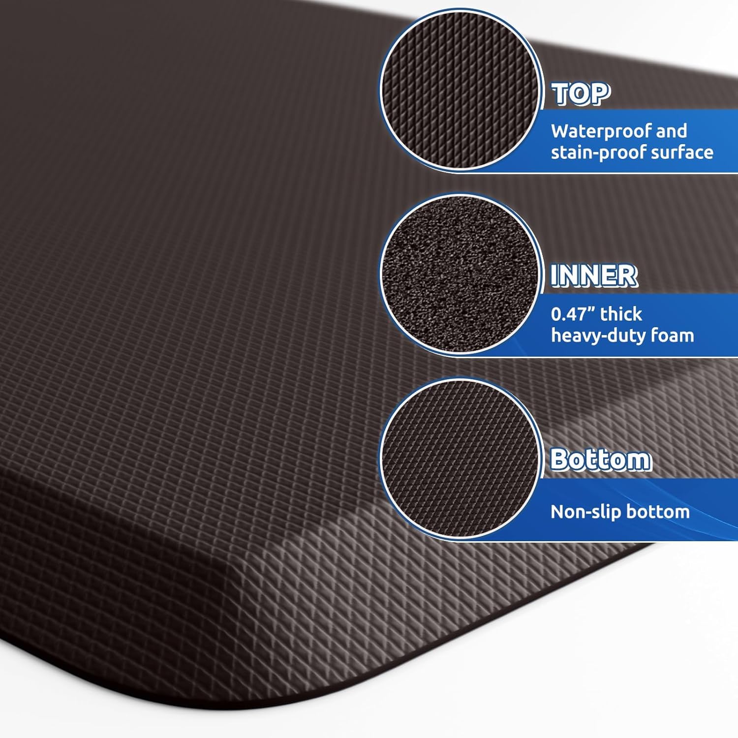 - EASY CARE: The anti-fatigue kitchen mat's surface is resistant to dust and debris. Its waterproof and stain-resistant material ensures easy cleaning with just a damp cloth, vacuum, or sweep, saving cleaning time and extending the mat's lifespan