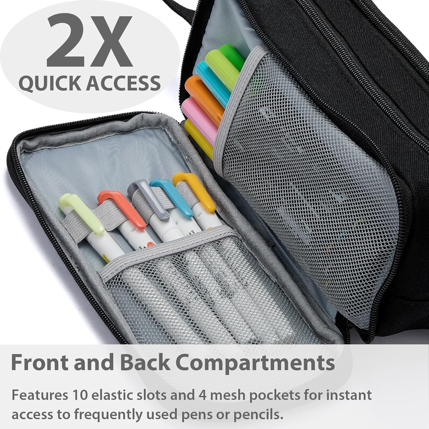 - Our pouches are 3 compartment design. The center pocket is wide opening, making it effortless to instantly store and organize your items. The side pocket is designed with 1 mesh pocket and 4 slots. They have a netbag on the bottom to prevent pens and pencils from falling out.