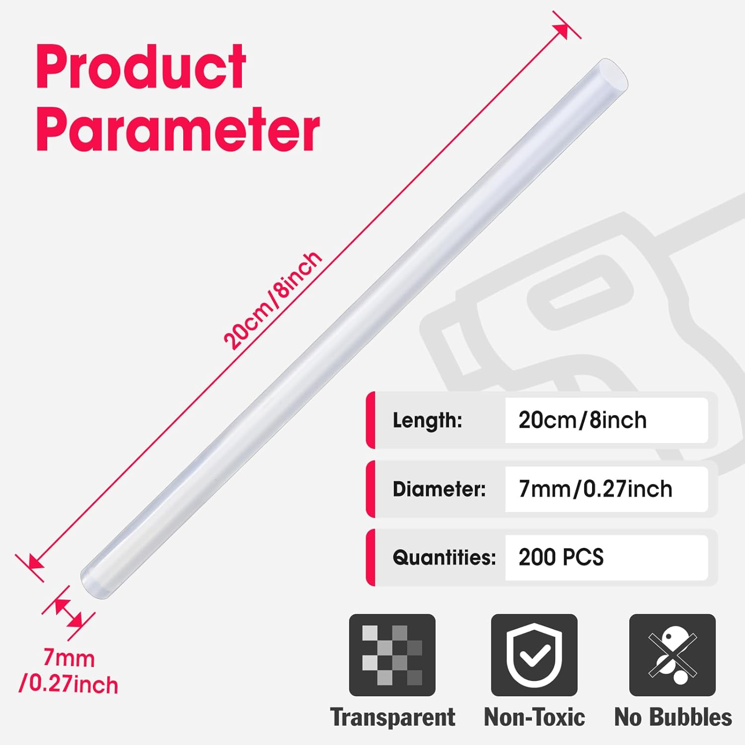 - Value Package: amazing set of 200 glue gun sticks, 8" long x 0.27" diameter, designed to fit all mini-sized glue guns.