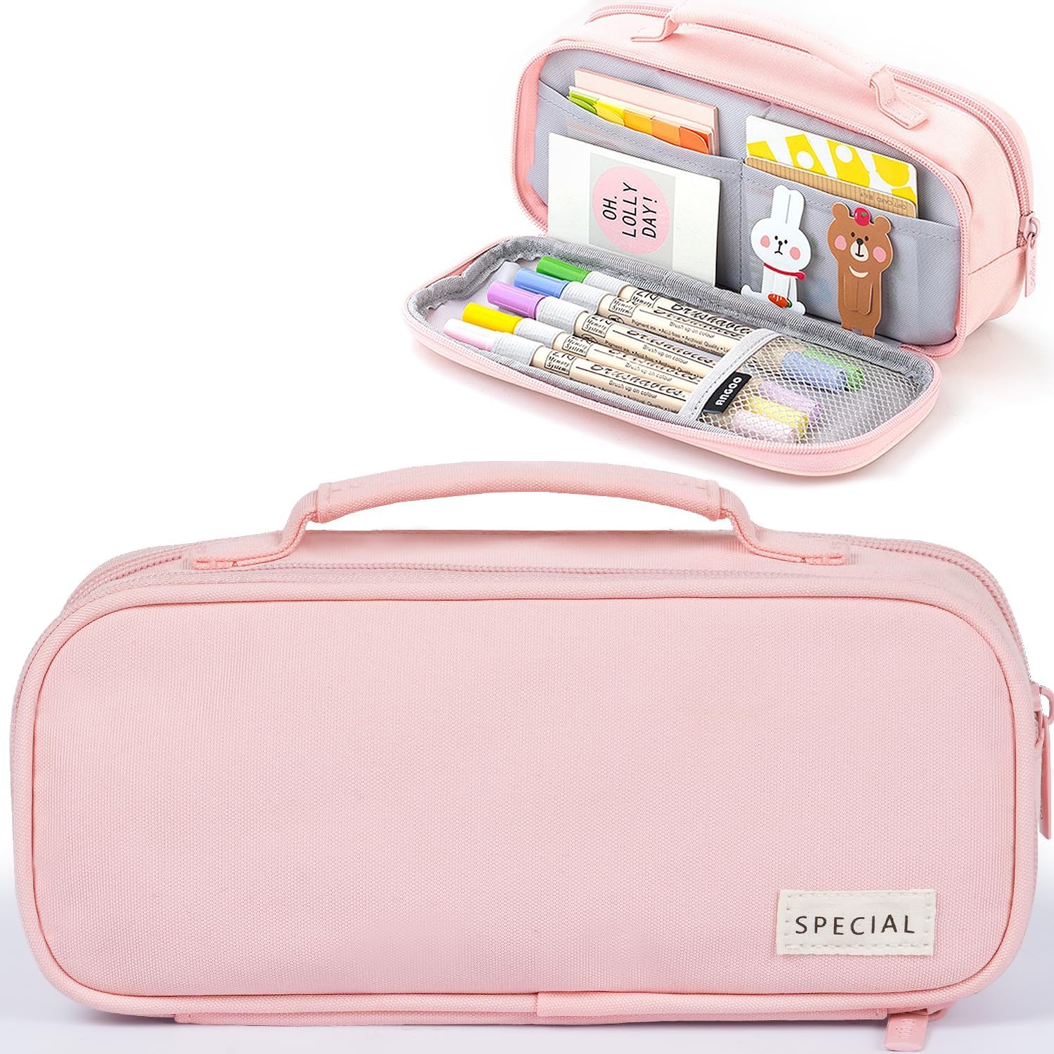 MAMUNU Pencil Case Large Capacity with 3 Compartments, Pencil Case Pouch Bag with Zipper Handle Portable Pen Stationery Organizer for Teen Girls Adults College School Office Travel, Pink