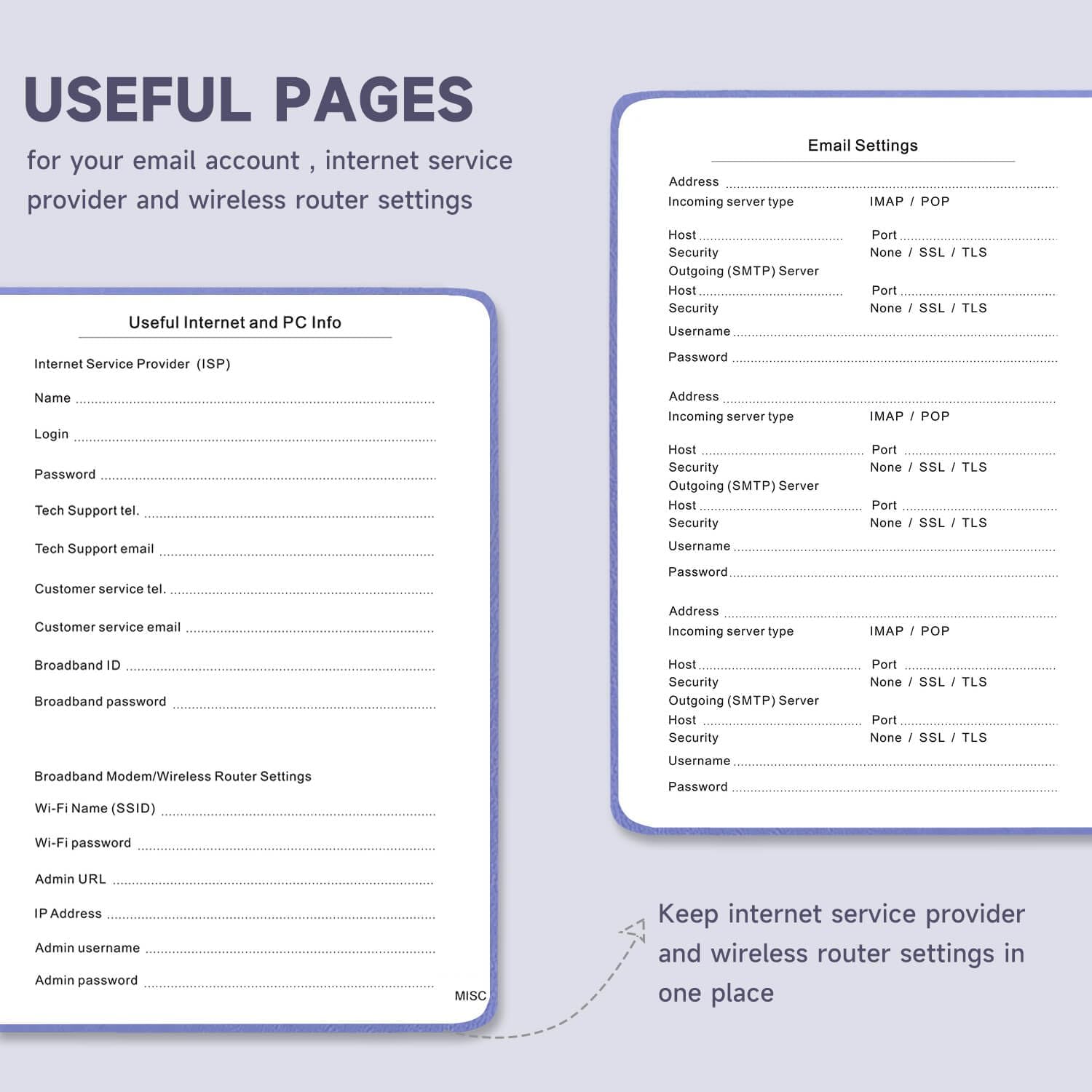 - All-In-One Password Book & More - This password organizer has space to store all the information you may need when you surf the web, including software license information, email settings, wireless router settings, and notes section.