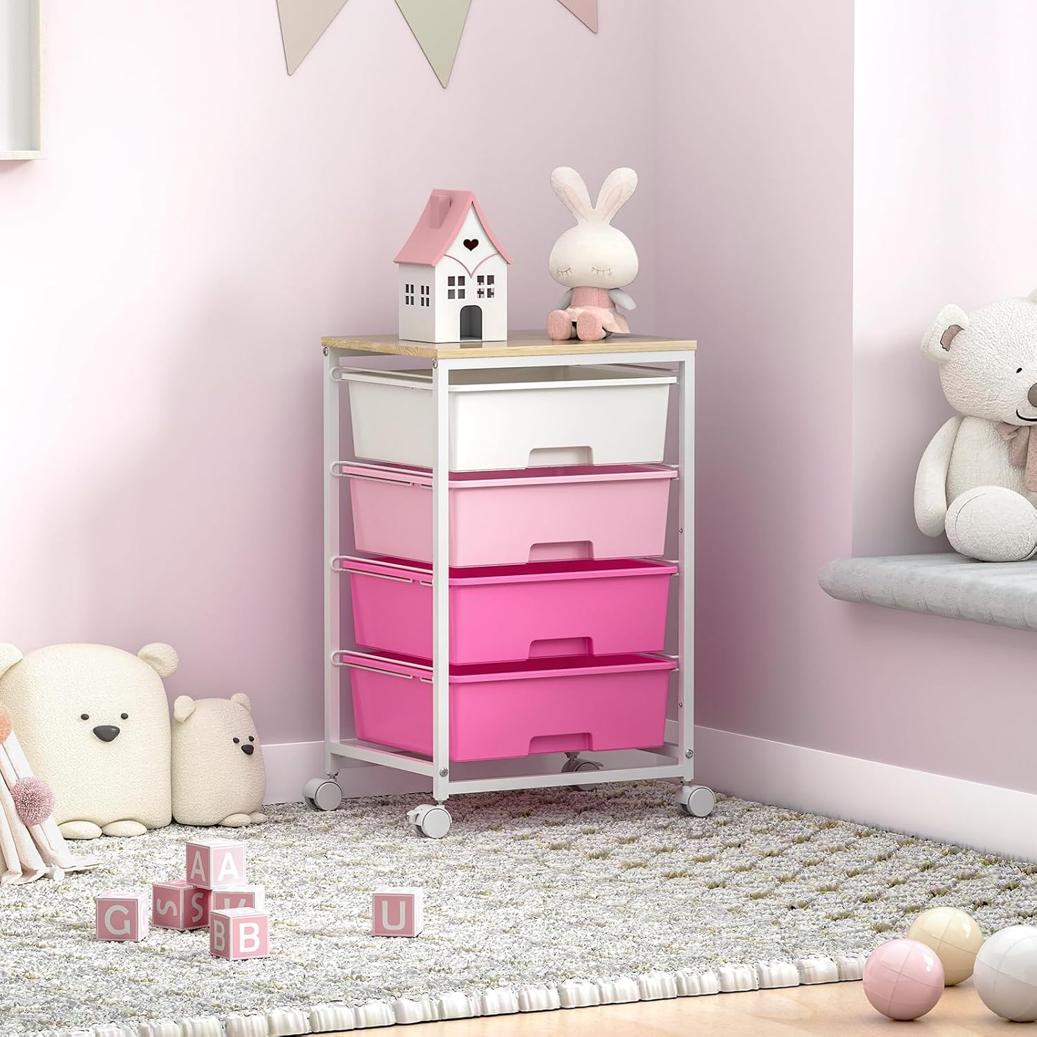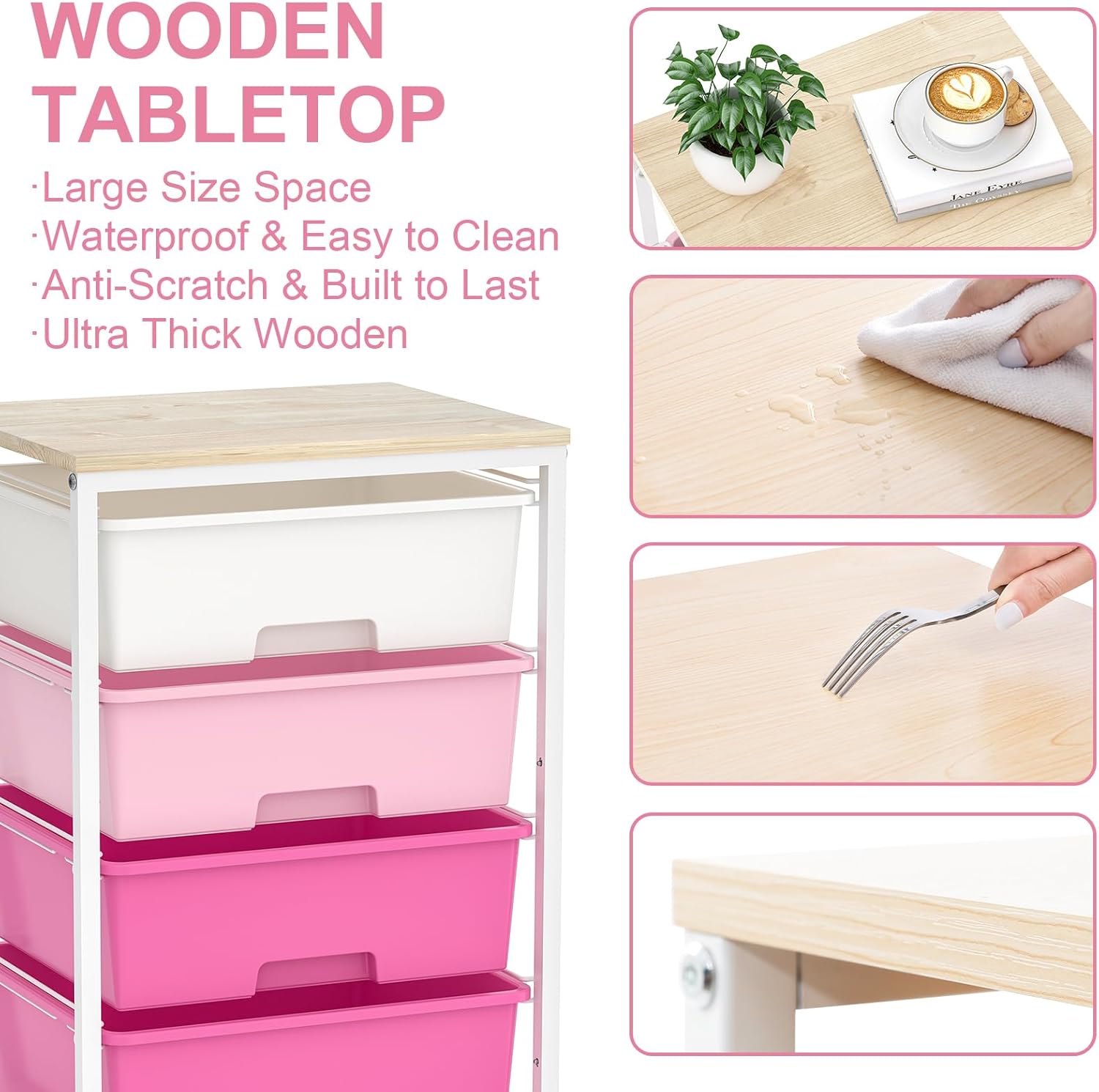 Utility-Rolling-Craft-Storage-Cart-Organizer with 4 Drawers and Wooden Tabletop, 4 Tier Drawer Cart for Home Office, Kid Room, Classroom Teacher, Dorm, Pink