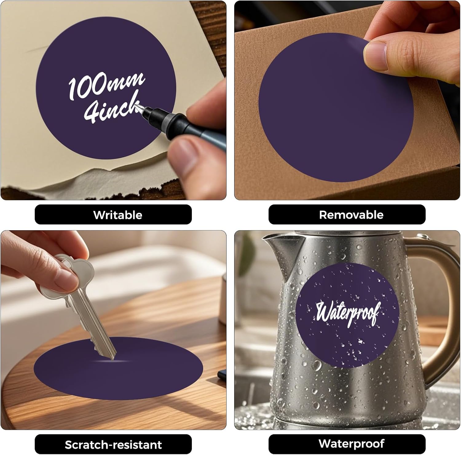 - Premium Quality: Round labels can stick on most flat and smooth surfaces such as paper, plastic, cardboard, glass and metal. The labels are not easily scratched and torn when used.