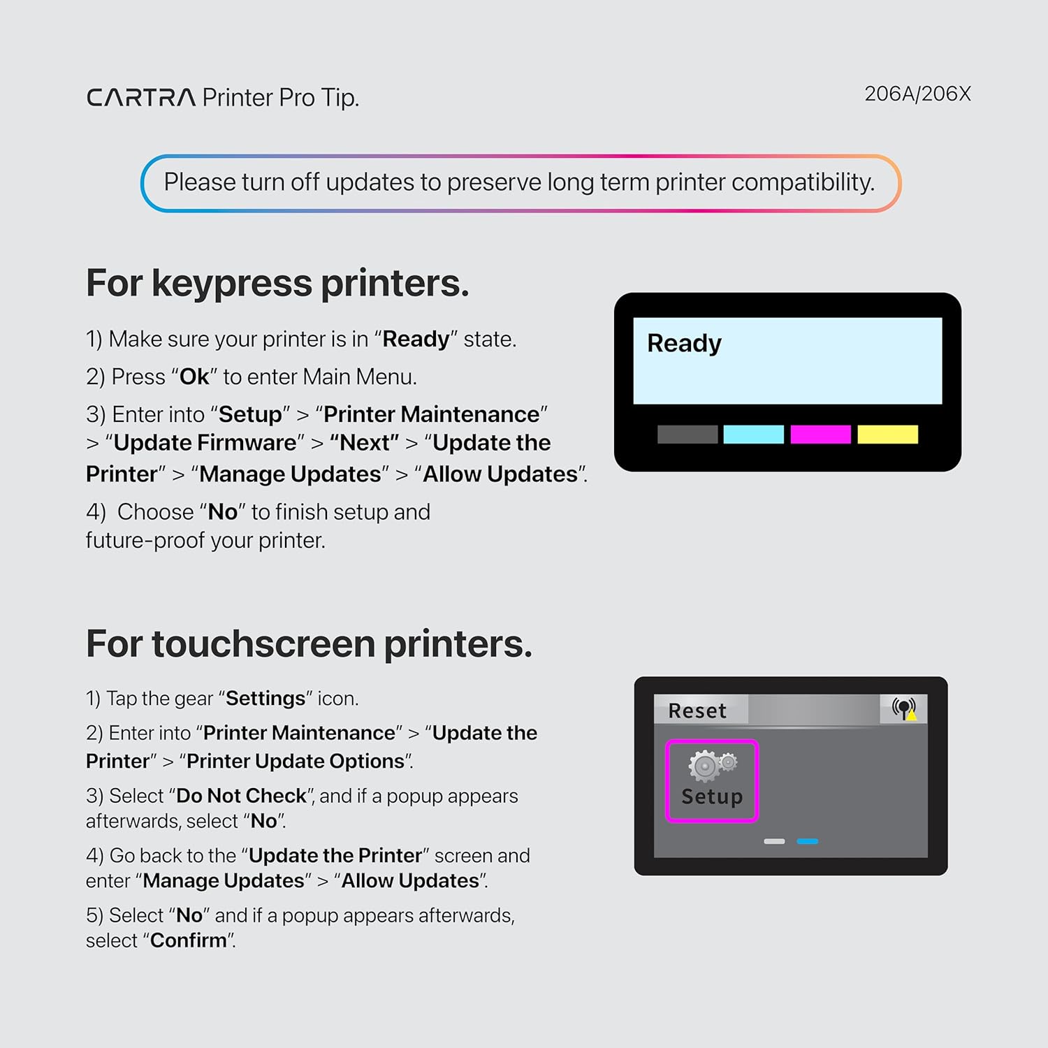 - Patented chip technology: Equipped with CARTRA’s patented chips, these 206A cartridges maintain a 100% connection rate with your printer, ensuring consistent quality and performance without any compatibility issues.