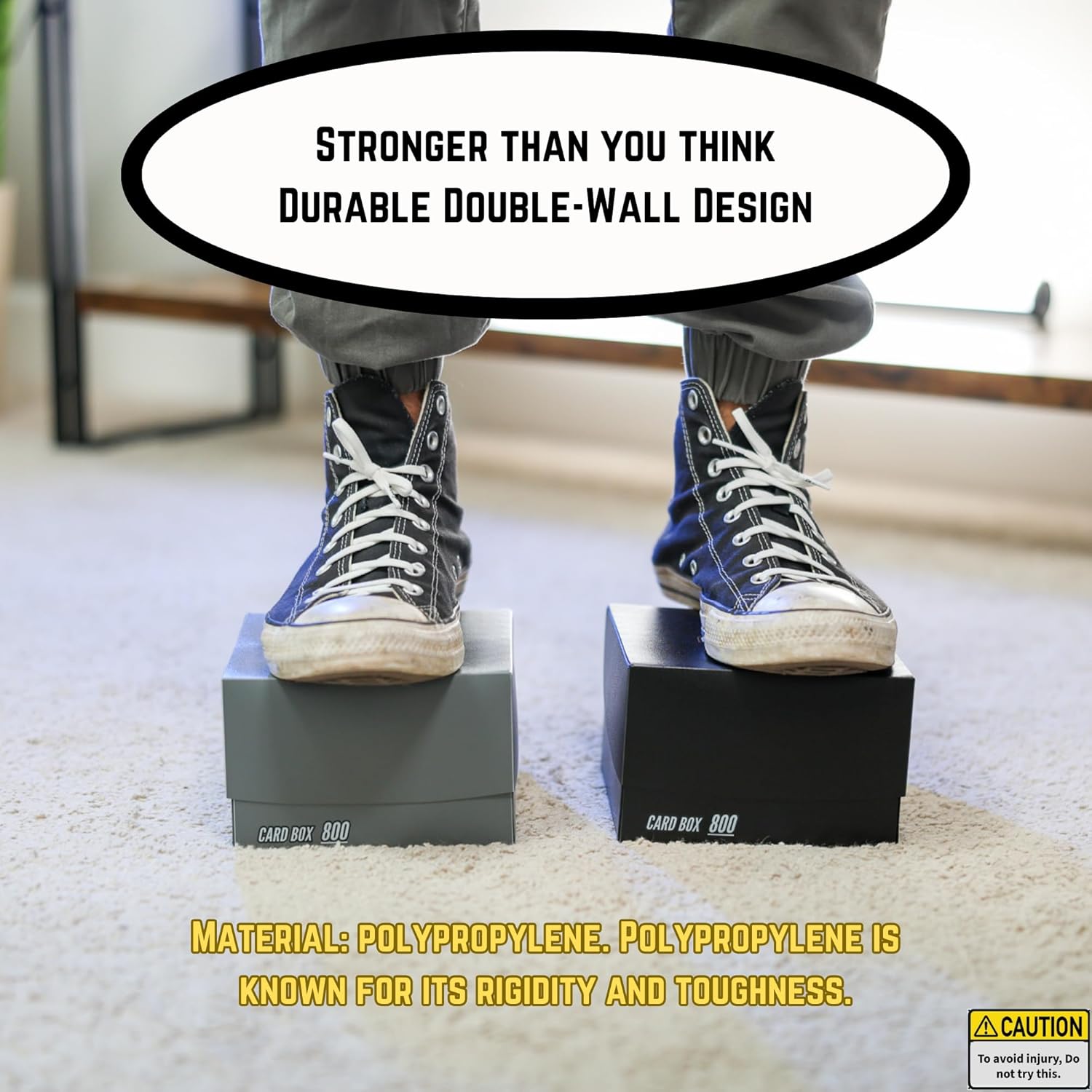 - MATERIAL AND DESIGN: The Collector’s Hubs Card Deck Box 800 is crafted for collectors who demand durability, structure, and effortless access. Featuring 4 fixed compartments, it keeps your cards perfectly sorted and protected—no sliding, no mess. The box is constructed with a DOUBLE-WALL DESIGN for extra strength and is made from polypropylene plastic, known for its exceptional toughness and eco-friendly qualities. Each compartment is wide enough for fast, easy access—reach in effortlessly and pull your deck out in seconds. Fits single and double-sleeved cards perfectly, keeping them straight and preventing sleeve bending.