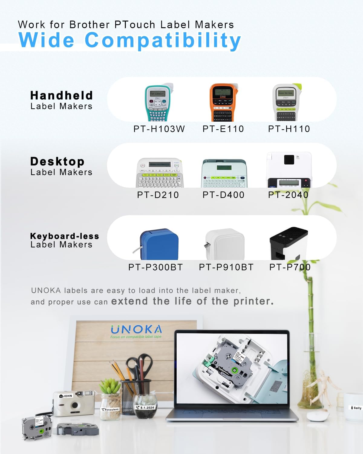 UNOKA Ptouch Tape 12mm 0.47 White Laminated Compatible with Brother Label Maker PTH110 PTD220 PTD210, TZe TZ Tape TZe-231 Black Ink on White Refills, Waterproof, Indoor/Outdoor Use, 2 Pack