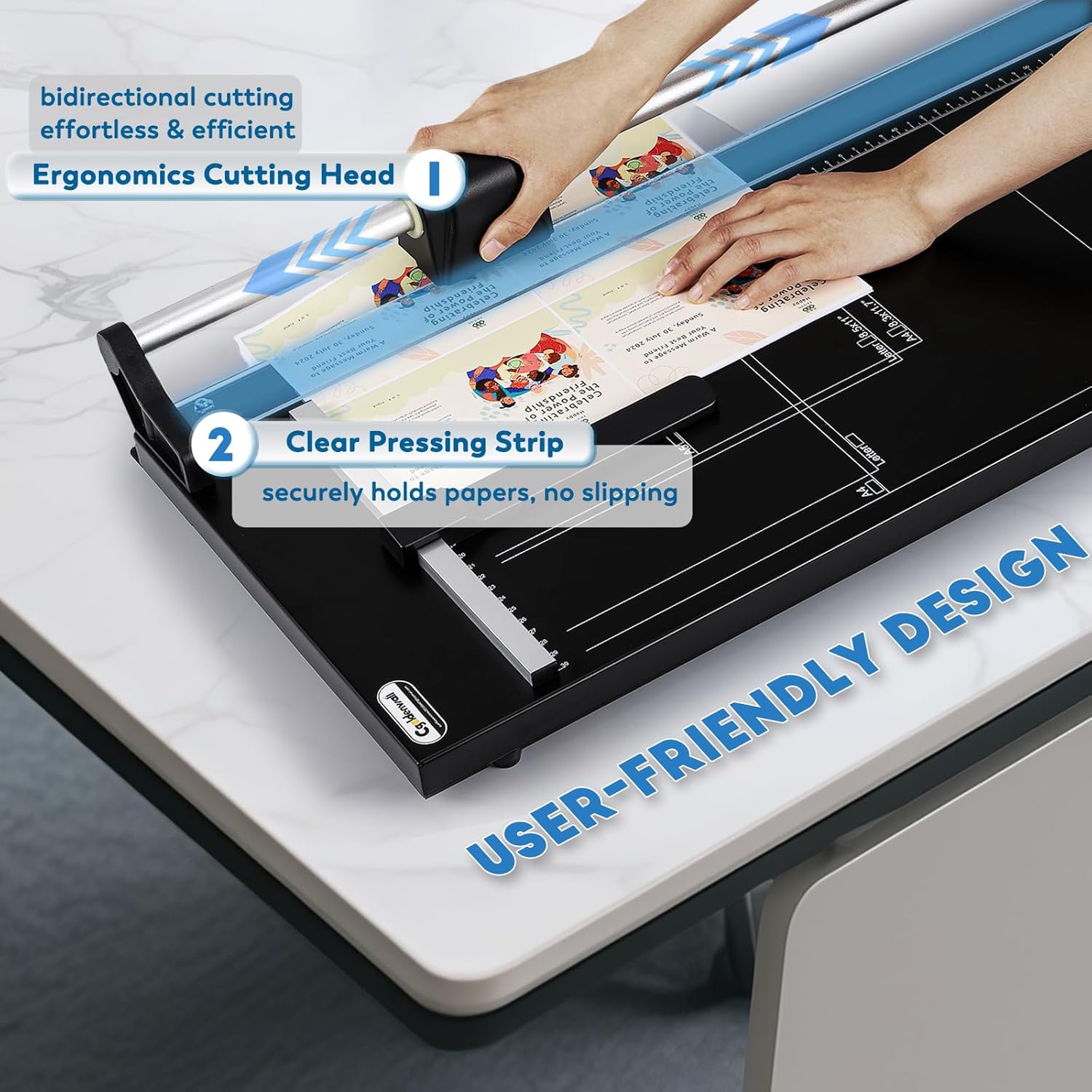 - USER-FRIENDLY DESIGN: Anti-slip ergonomic cutting head and bi-directional cutting feature saves labor and boosts productivity—perfect for repetitive tasks and prolonged use. At the same time, clear platen automatically clamps sheets in place to prevent deviation.