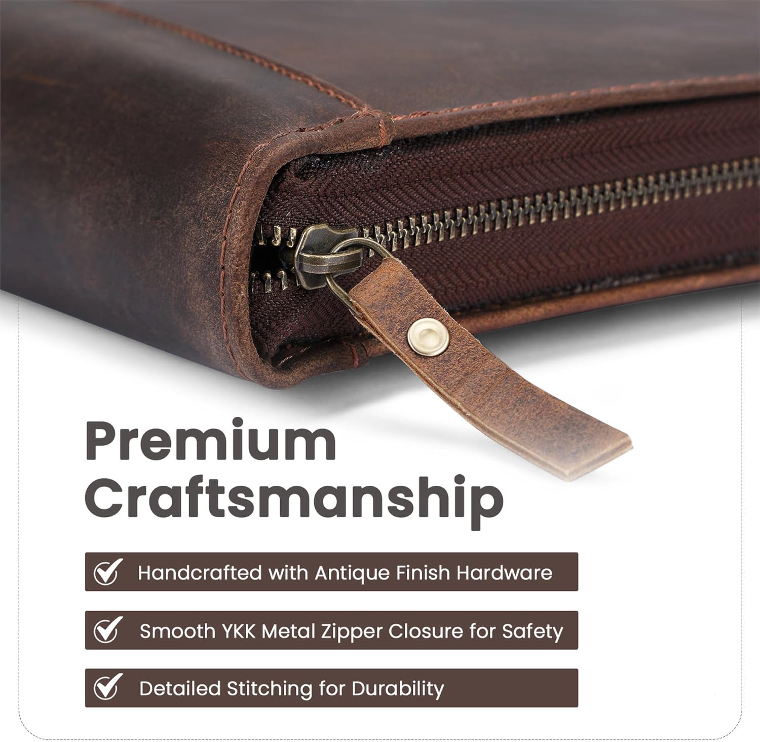 Premium Leather Portfolio Organizer with Zipper - Brown Business Padfolio with Card Slot, Document Holder, Pen Loops | Leather Padfolio with 3 Rings Binder Legal Pad Holder Podfolio for Men & Women