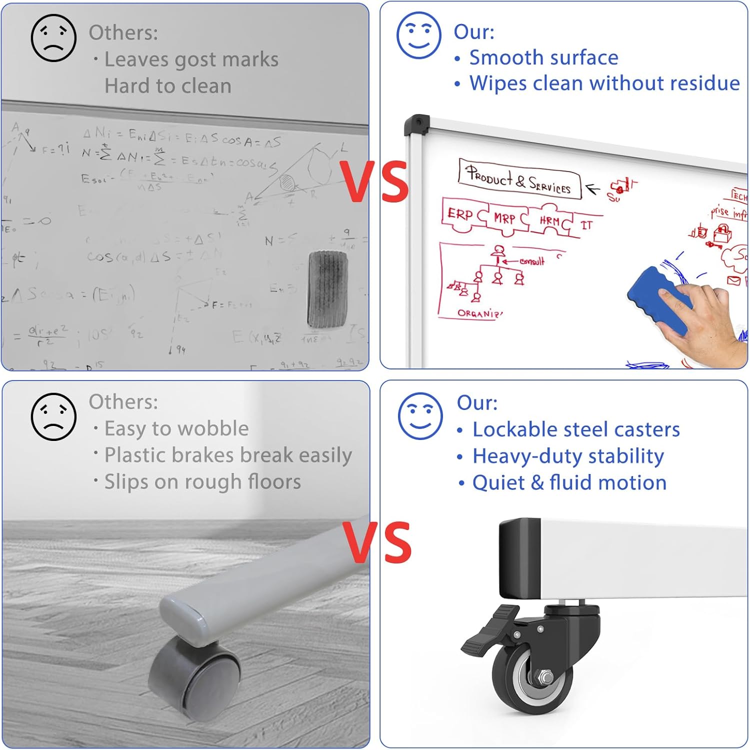 - Stable Frame with Smooth Rolling Casters: Built with integrated welded columns and a reinforced steel crossbar, this rolling whiteboard delivers excellent stability and long-lasting performance. Equipped with four 360° swivel silent caster wheels featuring locking brakes, it provides smooth, quiet mobility and secure positioning on carpet, hardwood, or tile floors.