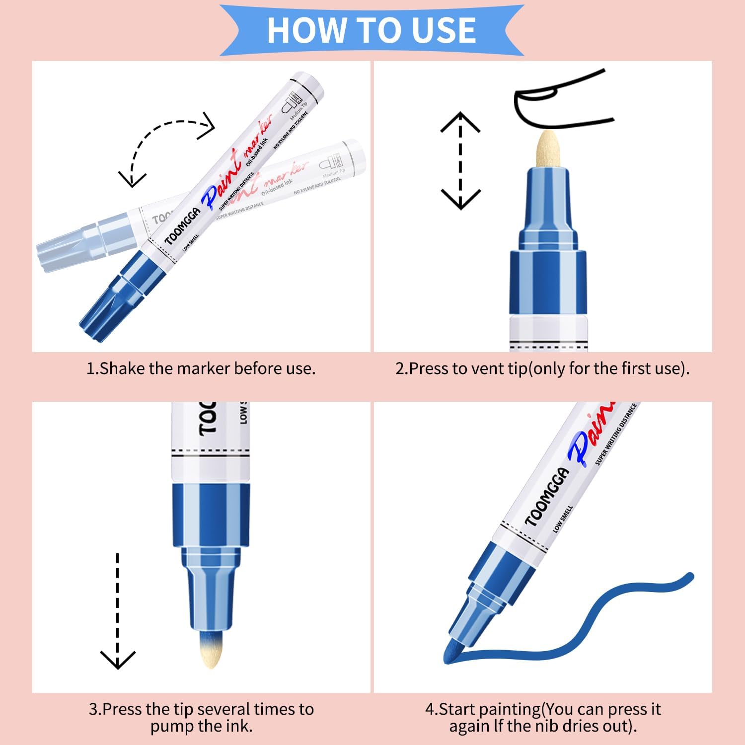 - Premium Quality: Each Blue paint pens paint markers is independently tested, selected, and packaged in individual heat shrink film. Before use: Face tip upright,push against finger. Re-cap and shake. Press tip on surface several times