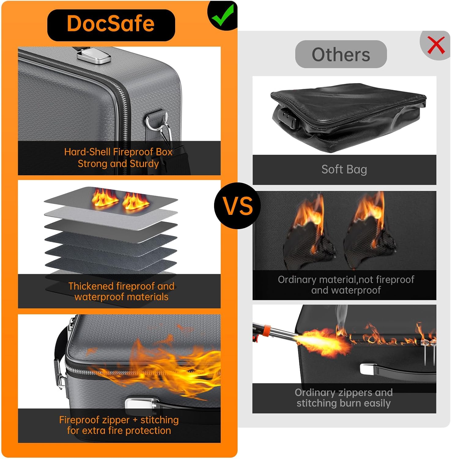 - Upgraded Hard-Shell Design Fireproof Document Box: Our fireproof document box combines hard-shell construction with fireproof materials, offering unmatched protection and durability. Unlike traditional soft case, our design withstands extreme conditions while maintaining a sleek, professional look. The Non-dusty material actively repels dust,hair and stains, keeping your box clean and tidy for years. It’s the ultimate solution for safeguarding your important documents, laptop, and valuables