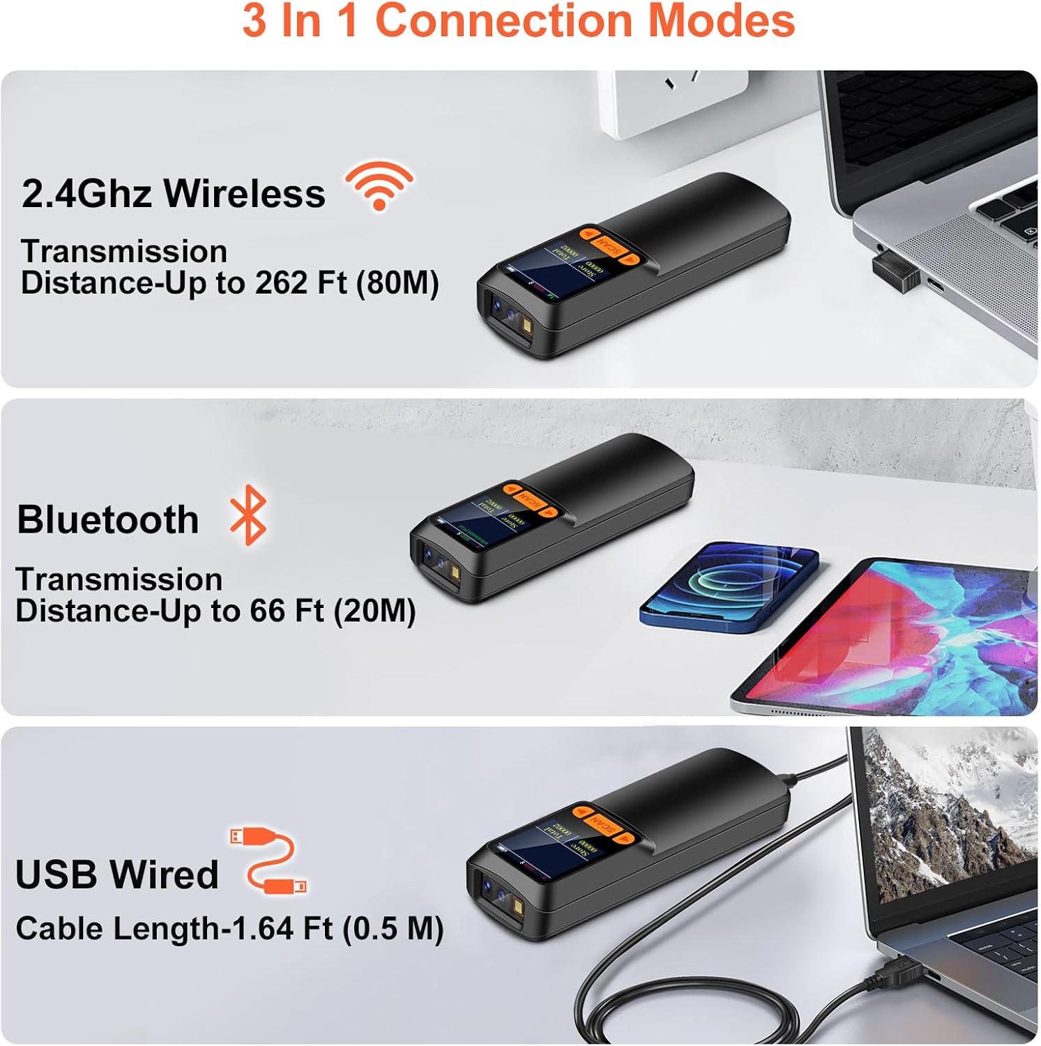- 🔋Bluetooth/Wireless + 2000mAh Larger Capacity Battery: Continuous working for 6-7 hours (Scanning every 5 seconds) after full charge, Meet more application scenarios. KUIIYER Mini Barcode Scanner can directly connect with PC/ POS by 2.4Ghz Wireless USB or USB cable, No drive/ software needed. Compatible with Computers' Windows, Macos, Linux and universal POS systems (▲Not Compatible with Square POS system). Bluetooth Connection will support for iPad, iPhone, Android, Tablet etc.