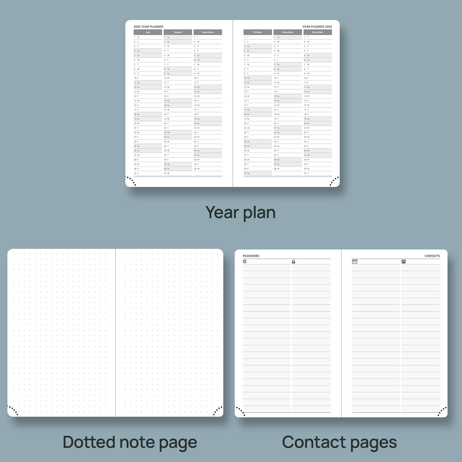 - EXTRA FUNCTION PAGES: This 2026 weekly planner also contains "2026-2027 Year Planner " Page + "2026 Holiday Reference & Calendar" Page + Monthly Expenses Page+ Contact & Password Pages + 8 Dotted Notes Pages for jotting down your ideas, thoughts or any other happy things in detail.