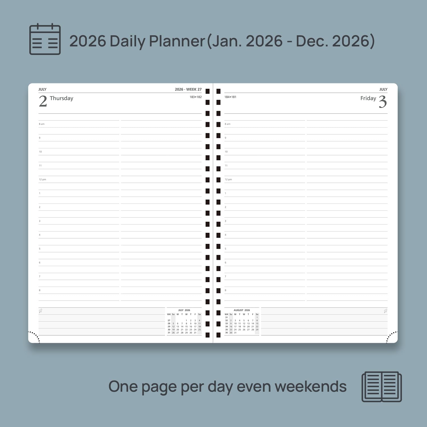 - One Page Per Day Even Weekends:This daily planner (Jan 2026- Dec 2026)features 365 daily pages,which presents spacious everyday planning with hourly schedules for your appointments, which makes your busy daily routines organized.