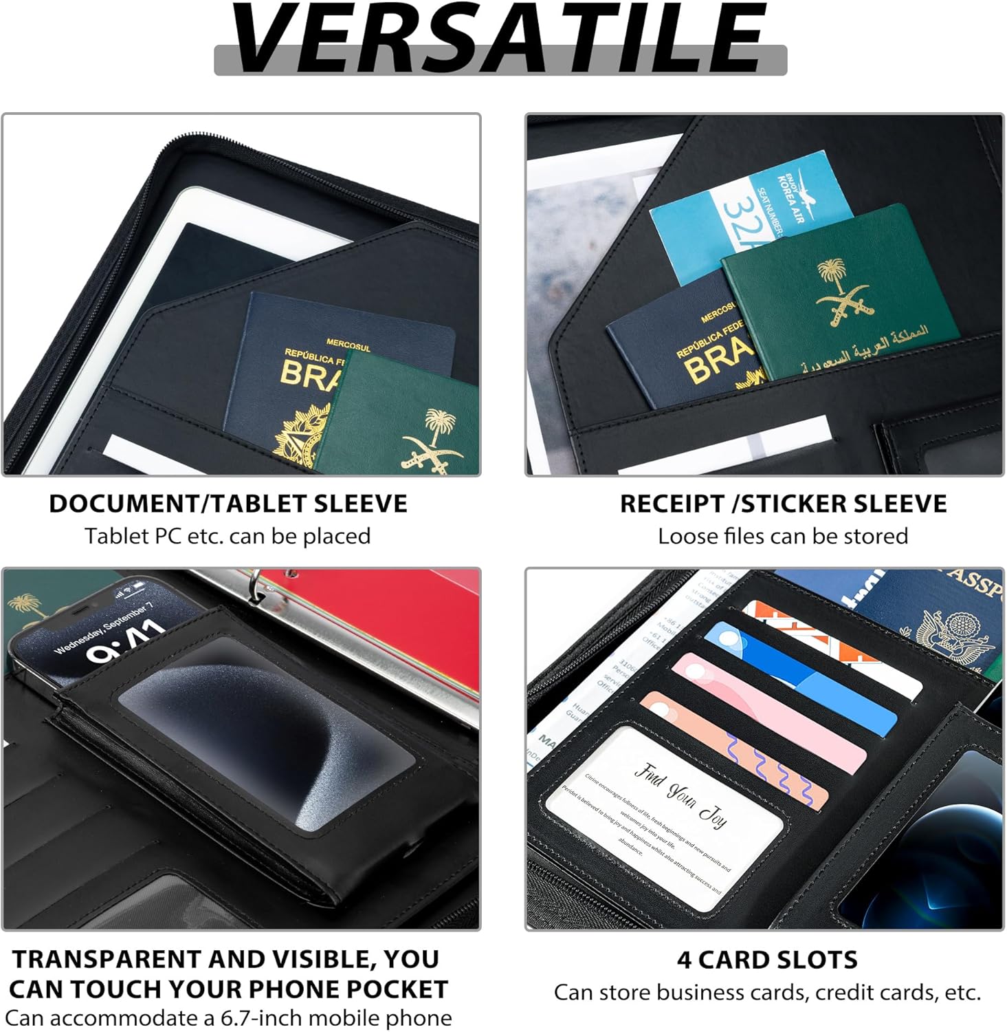 - Clipboard with Secure Storage: Stay clutter-free with 5 pocketed dividers (10 pockets), a built-in full-size refillable notepad (8.5x11”), 4 card slots, a clear phone pocket (fits large phones, charging port accessible), a receipt sleeve, and a pen loop. Everything has its place, instantly accessible.