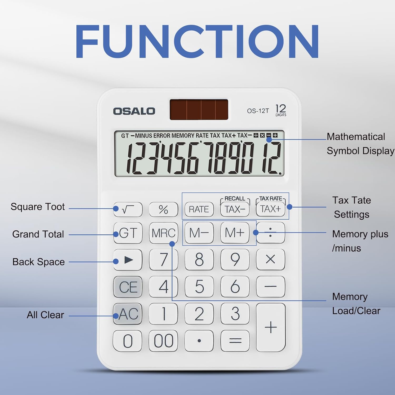 Pendancy Pocket Small Size Desk Calculator, 12 Digit Large LCD Display, Basic Tax Function Handheld Desktop Calculator with Solar Battery Dual Power, for Office, School, Business OS-12T (White)