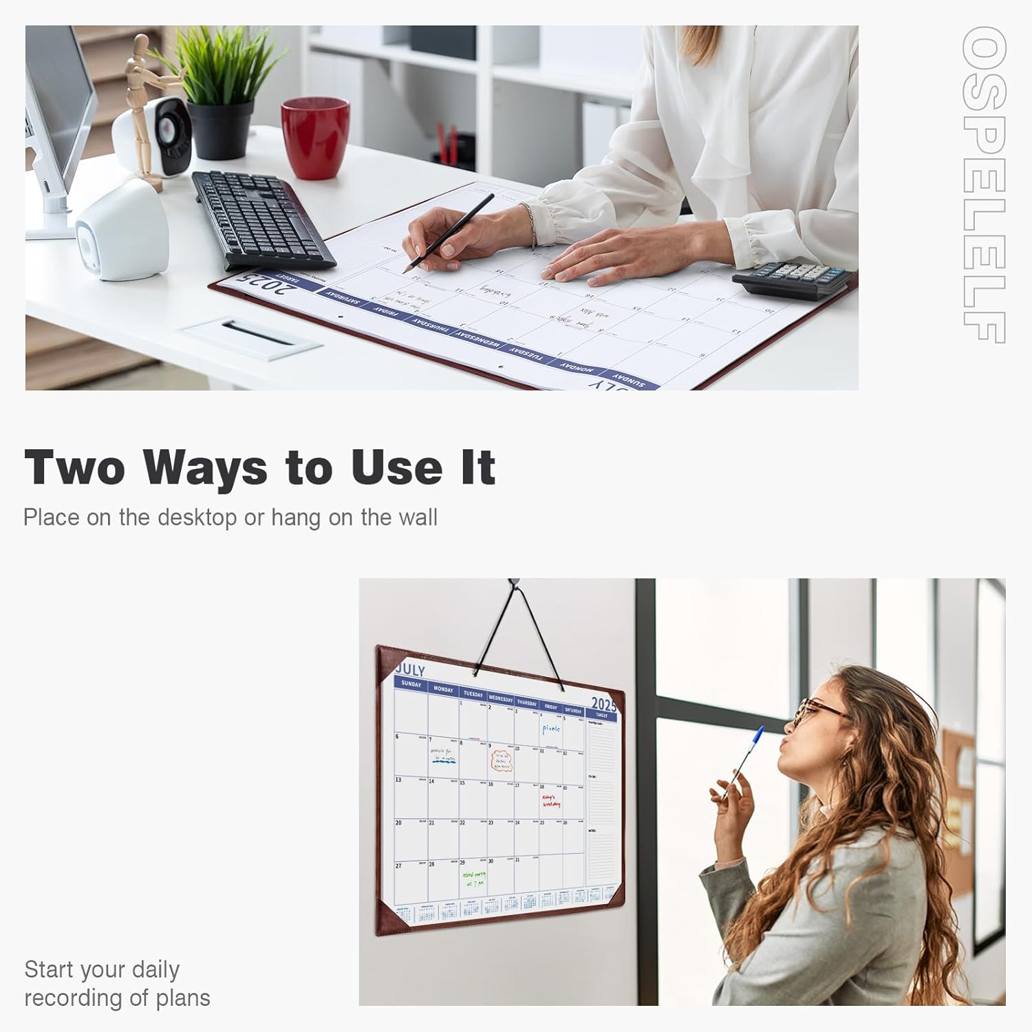 - Two Ways to Use It: The calendar can be placed on the desktop or hung on the wall by using our matching detachable string. Two hanging holes enable it to also be used as a wall calendar. In addition, the matching faux leather pad can be used as a desk mat or mouse pad.