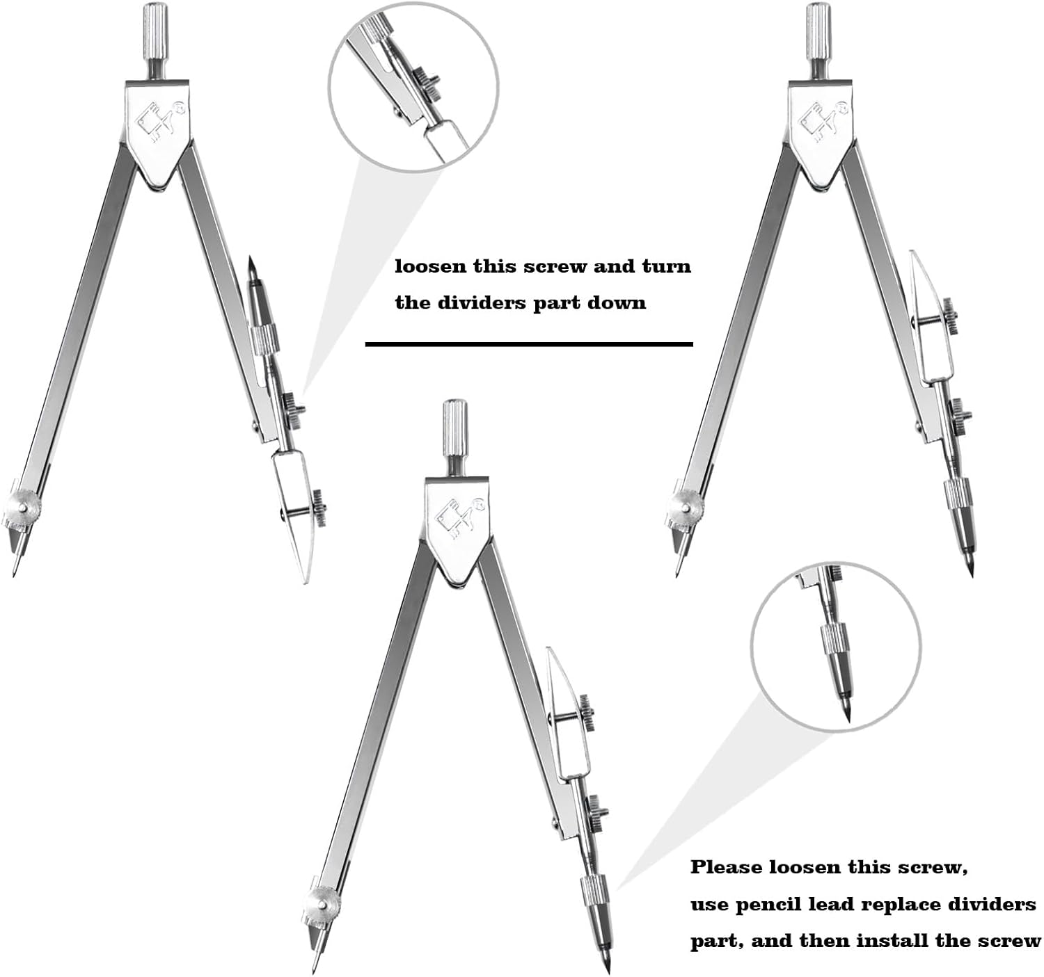 - Diverse tips design compass: compass is made of stainless steel, sturdy mechanism can hold a radius well; The opposite side of the pencil end is an adjustable separated jaw which allows you to fix the ink or paint