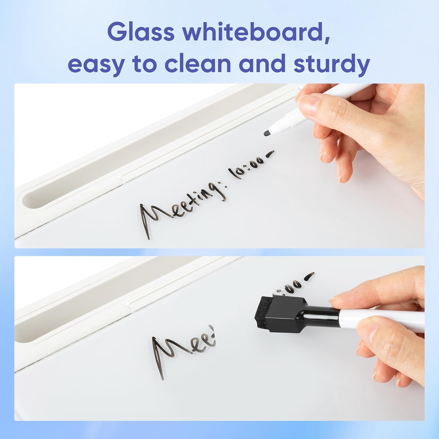 - 【Premium Quality】Our dry erase board for desk crafted from high-quality glass, the surface is sturdy and durable, remaining as smooth and spotless as new even after long-term use. Its solid one-piece construction eliminates the hassle of assembly while enhancing overall sturdiness. The package also includes four premium markers and a high-quality dry eraser, allowing you to start using it right out of the box
