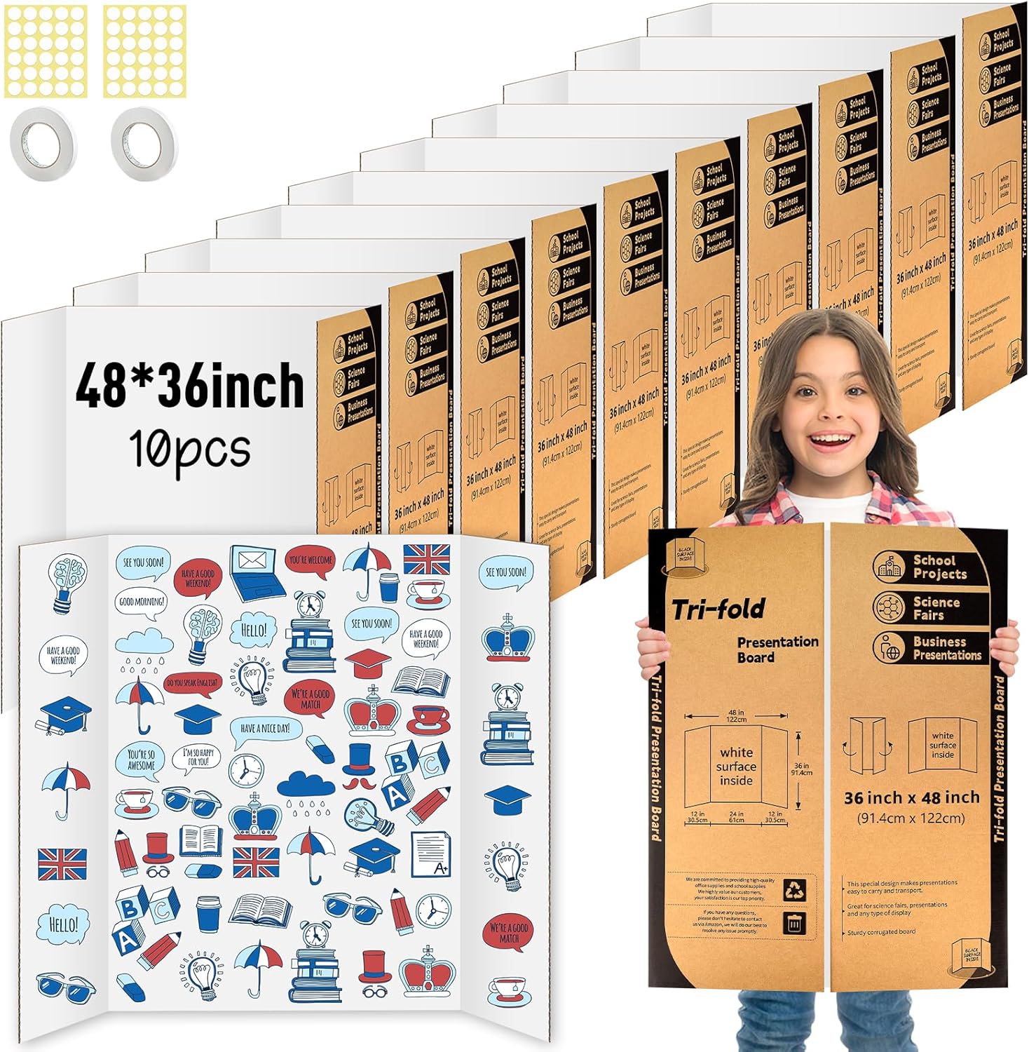 - Package included: Tri-fold Poster Board 10 Pack, 2 rolls of double sided adhesive tapes and 2adhesive dots, these all for Art, Display, Projects use.
