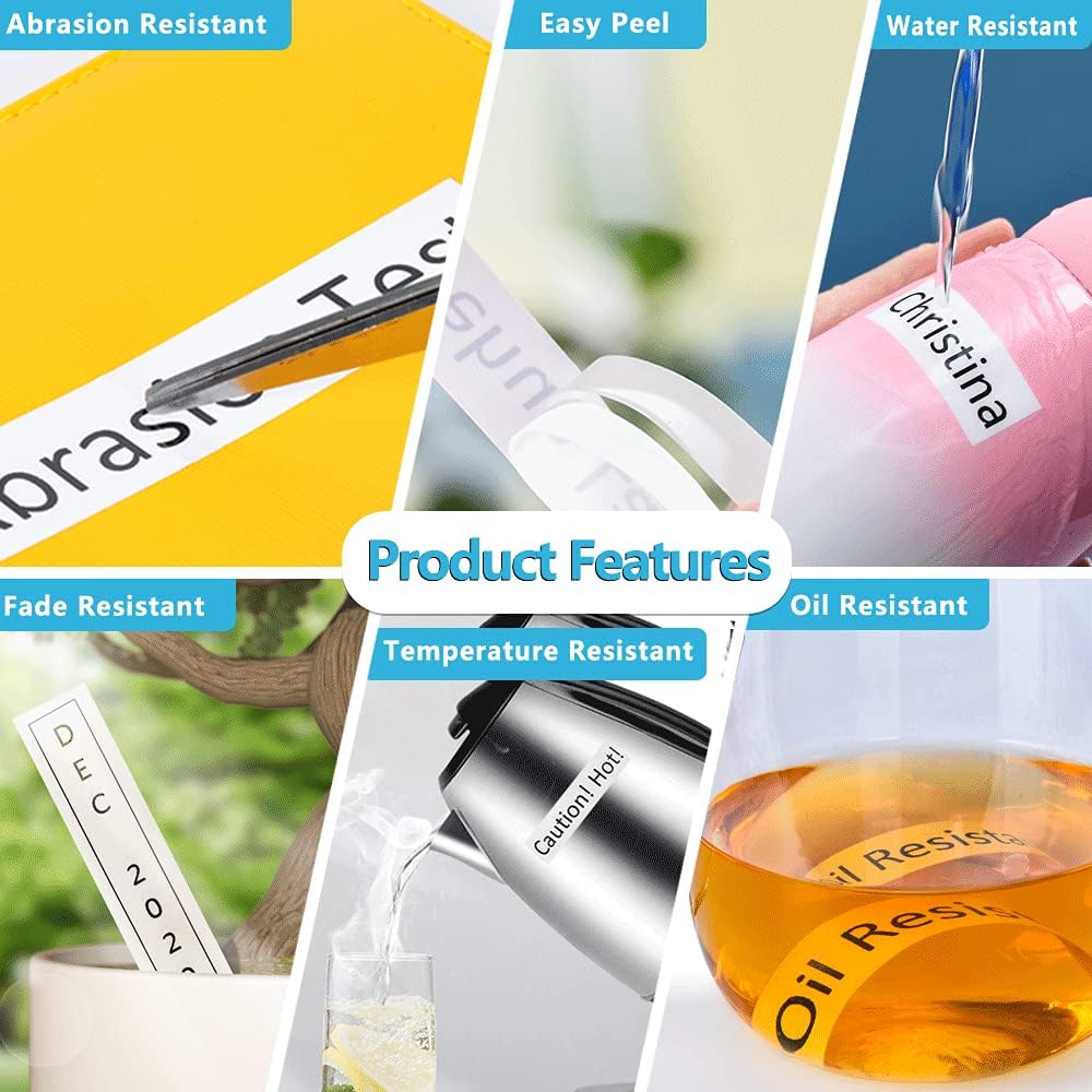 - Black-on-White Laminated Tape: High-contrast black text on white laminated surface for professional labels compatible with Brother Ptouch systems