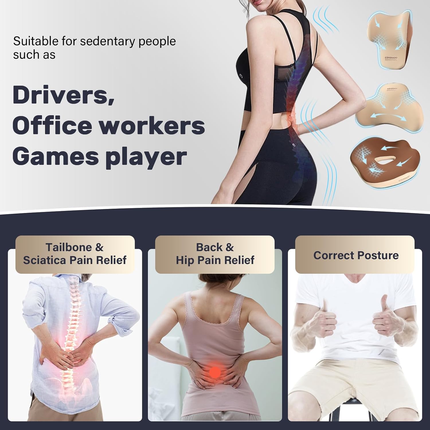 Coverado Seat Cushion and Lumbar Support Headrest Pillow for Car Office Chair, Ergonomic Memory Foam Chair Cushion Back Neck Support Pillow, Sciatica & Back & Tailbone Pain Relief Cushion-Beige