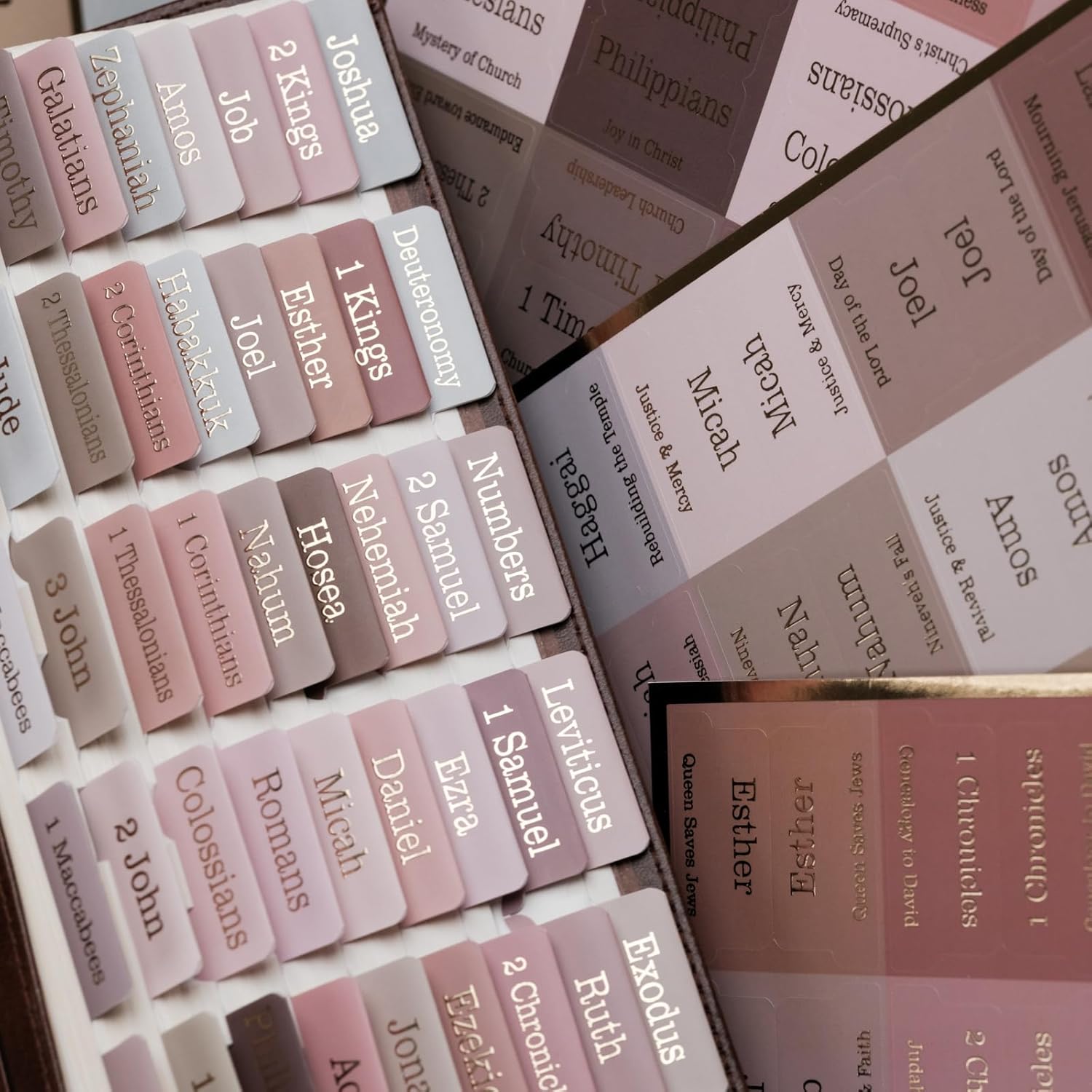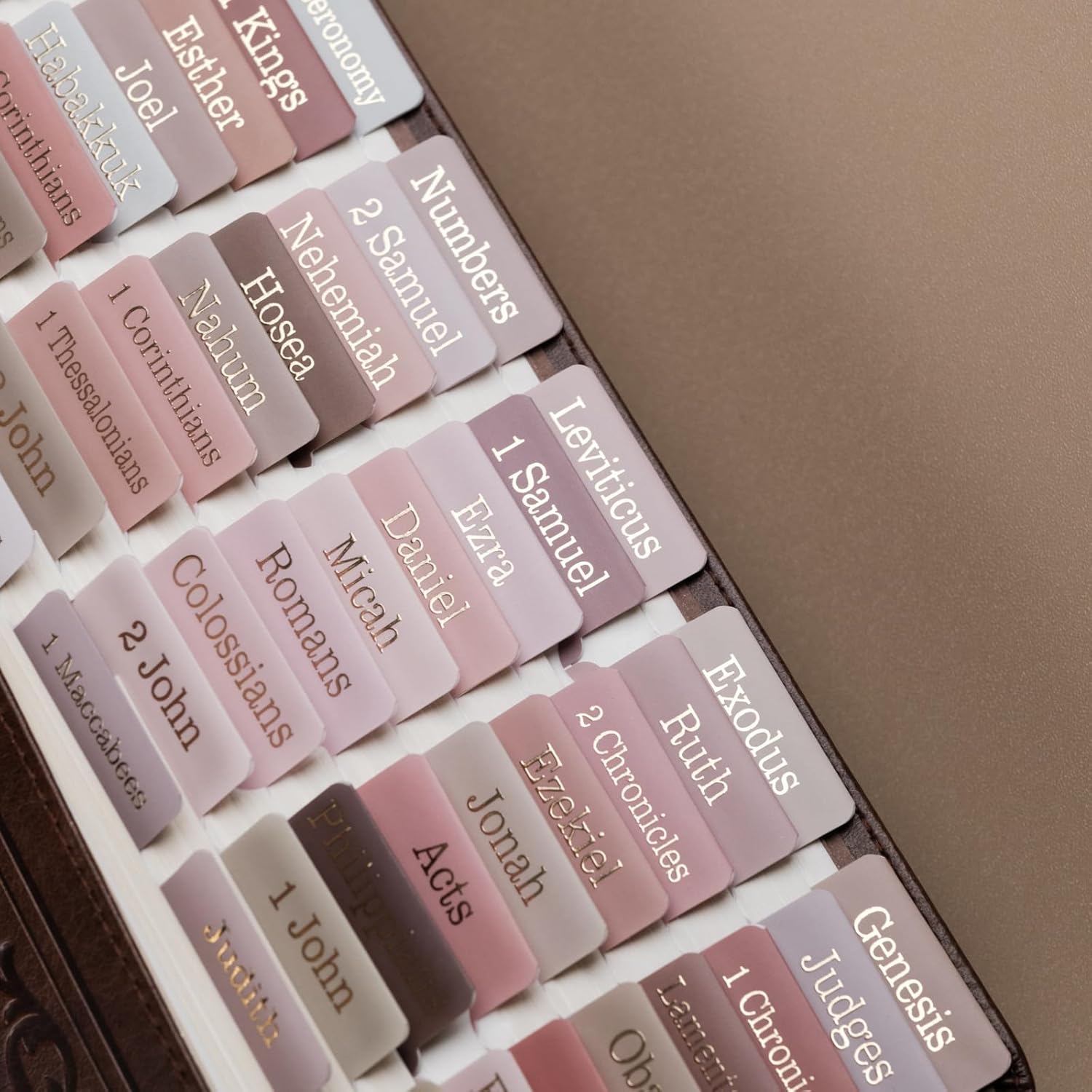 - Unique: Bible tabs with Summary Descriptions and Gold Foil Embossed Lettering.Catholic bible tabs 73 books,This is the ideal christian gi.ft. These unique Bible index tabs make a great gi.ft for your girlfriend, mum, kids, or anyone who loves beautiful things in life.