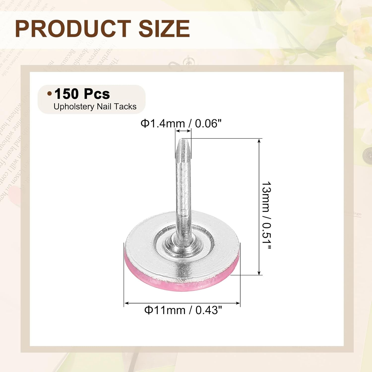 - [Size & Quantity] - The package comes with 150pcs decorative upholstery tacks. Sufficient quantity to meet your different daily needs. The overall size of upholstery nails is about 11mm x 13mm/0.43-inch x 0.51-inch(D*H)