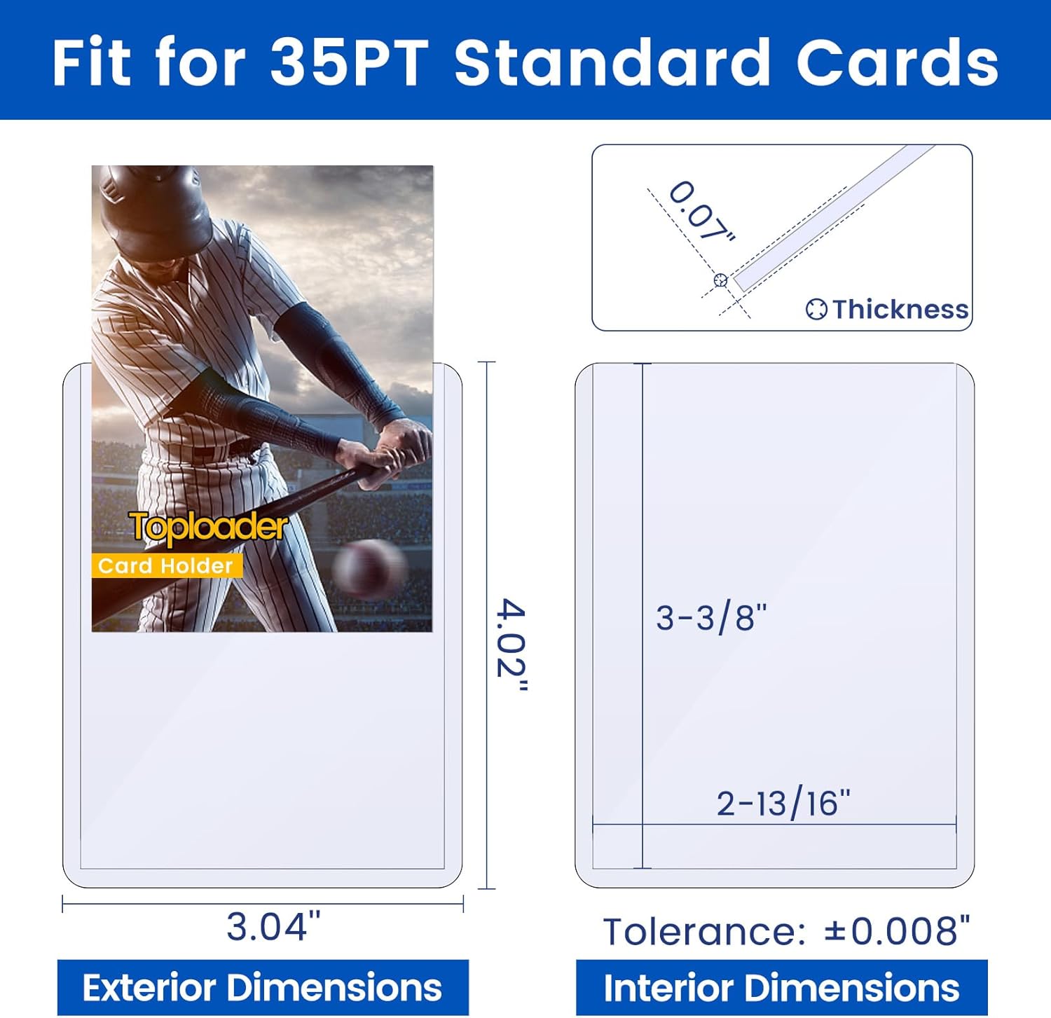 - Standard Sized Toploaders and Penny Sleeve: All to hold 2-1/2" x 3-1/2" (63.5mm x 88.9mm) standard size cards up to 35 points in thickness. 3" X 4” Toploader Sizer: Exterior Dimensions: 3" x 4", interior Dimensions: 2-3/4" x 3-7/8" Clear Sleeve size: 2-5/8 x 3-5/8 inches (67mm x 94mm).