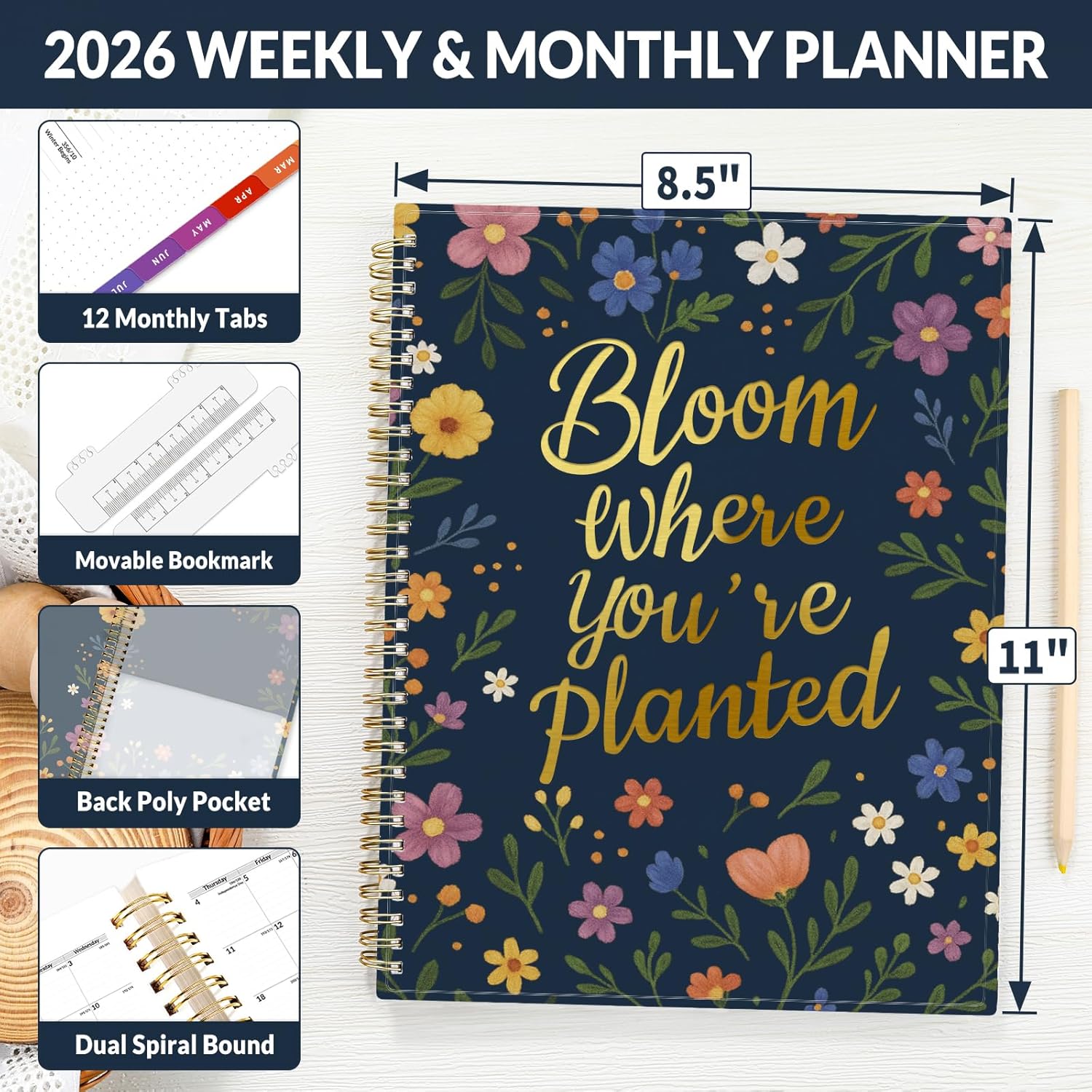 SUNEE 2026 Weekly and Monthly Planner - from January 2026 - December 2026, 8.5"x11" Daily Agenda Planner with Monthly Tab, Flexible Cover, Note Pages, Pockets, Bookmark, Spiral Binding, Navy Flower