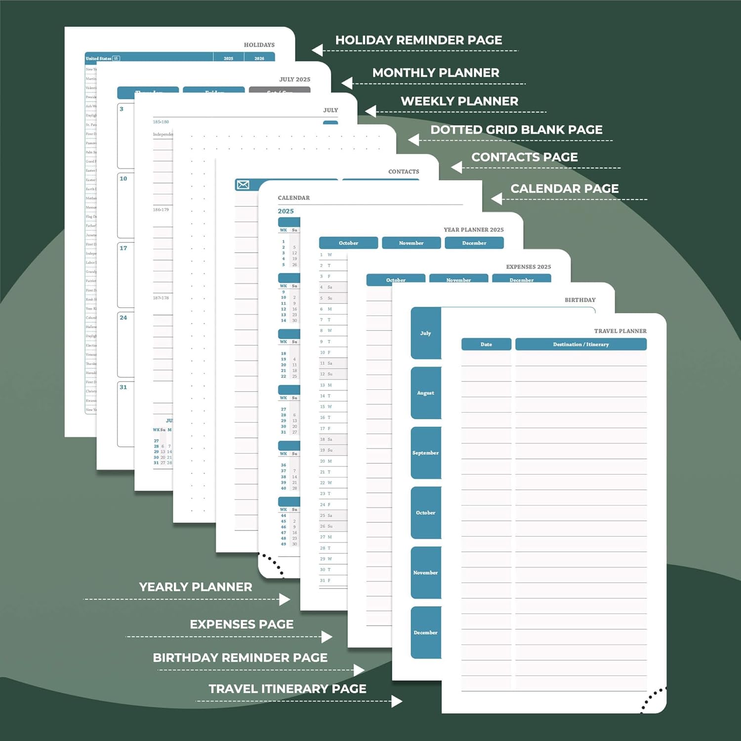 - Multi function Page: Personalized planner system. Year plan pages, holiday reminders, birthday record area for relatives and friends; set up storage contacts, and record inspiration and plans with the dot matrix note area; at the same time, work planner can travel planning and expense management modules to achieve coordination of schedule and finance